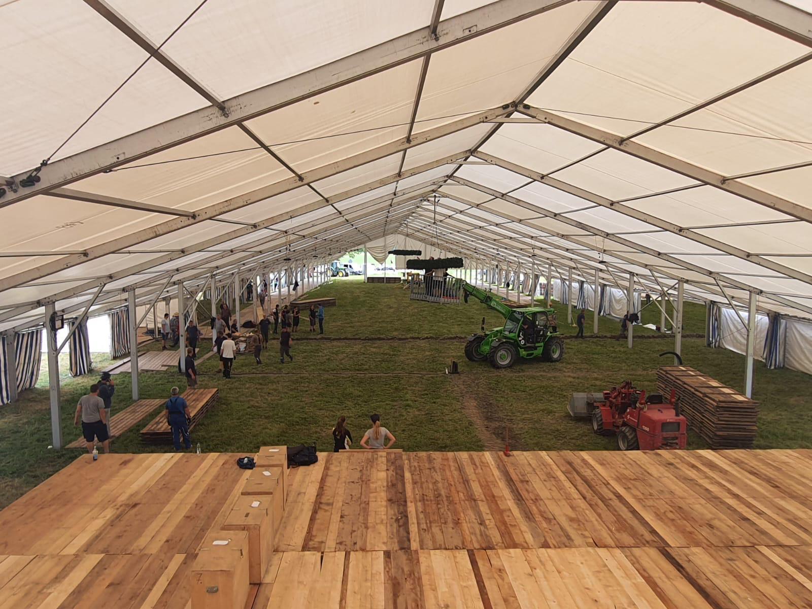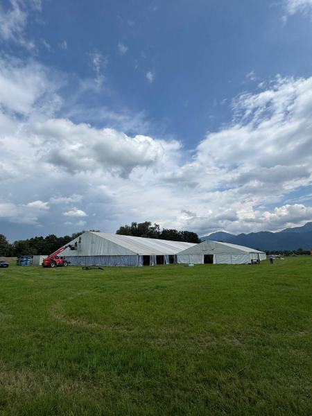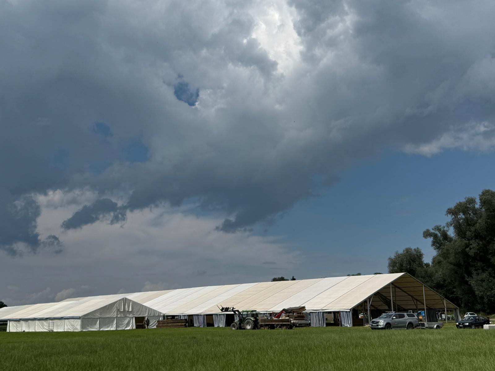 Schon gestern waren Vorarbeiten geleistet worden unter Anleitung von Eberhard Freimoser, dem Zeltrichtmeister. In einer unglaublichen Leistung der vielen Helfer konnten heute das Gaufestzelt und alle Anbauzelte in der Feldwies aufgestellt werden! 4000 qm Festwiese haben nun ein Zeltdach! Sogar vom Schnappenkirchal sieht man unser Festzelt.