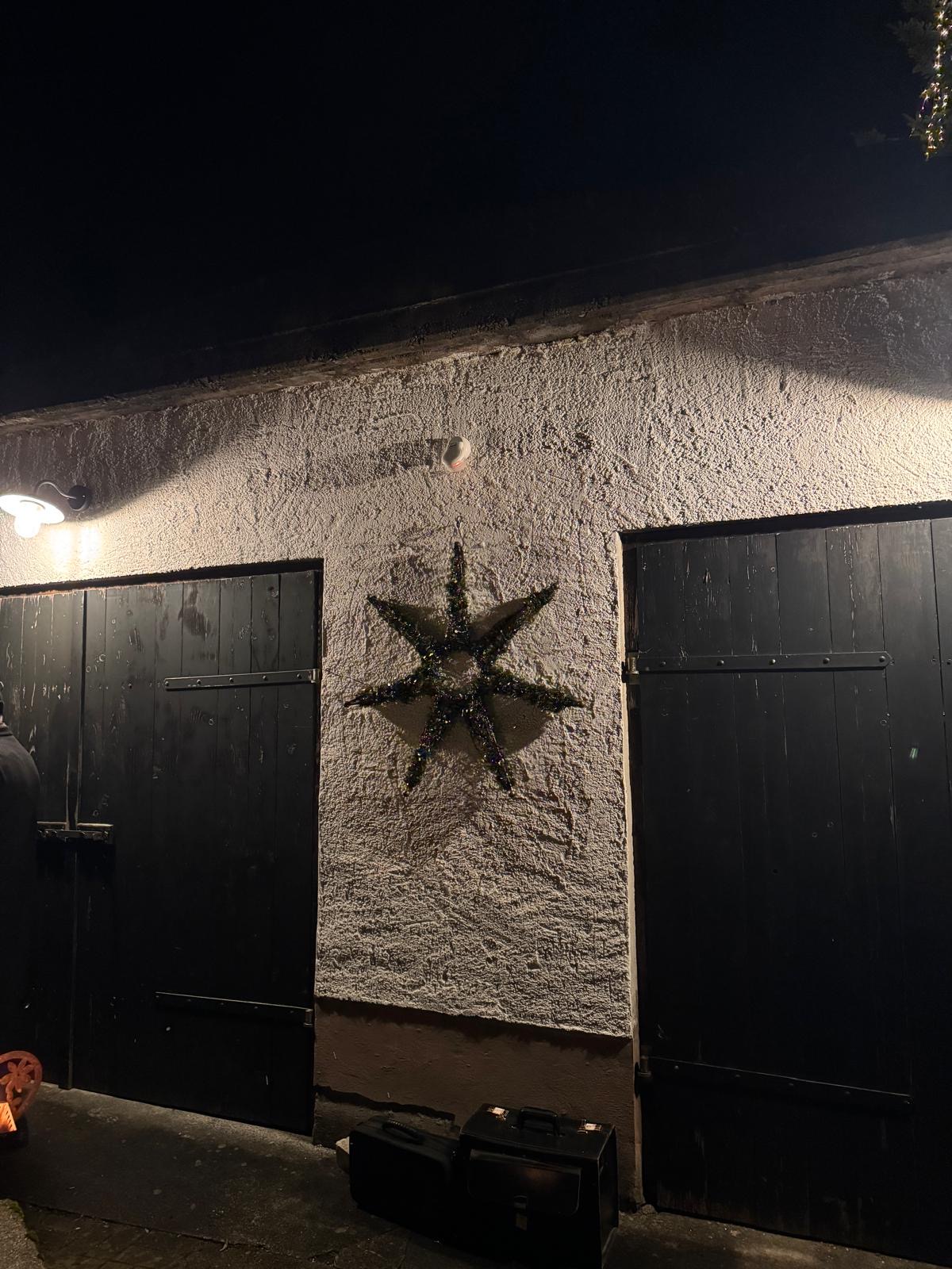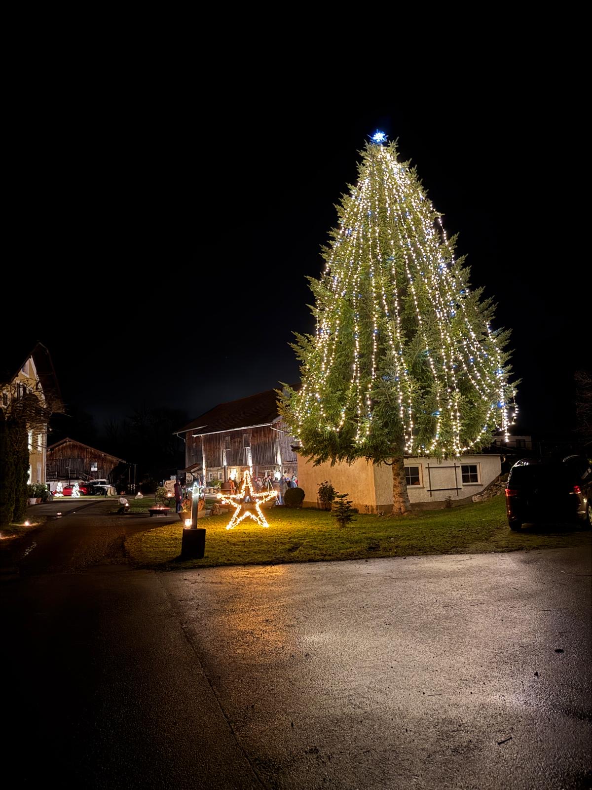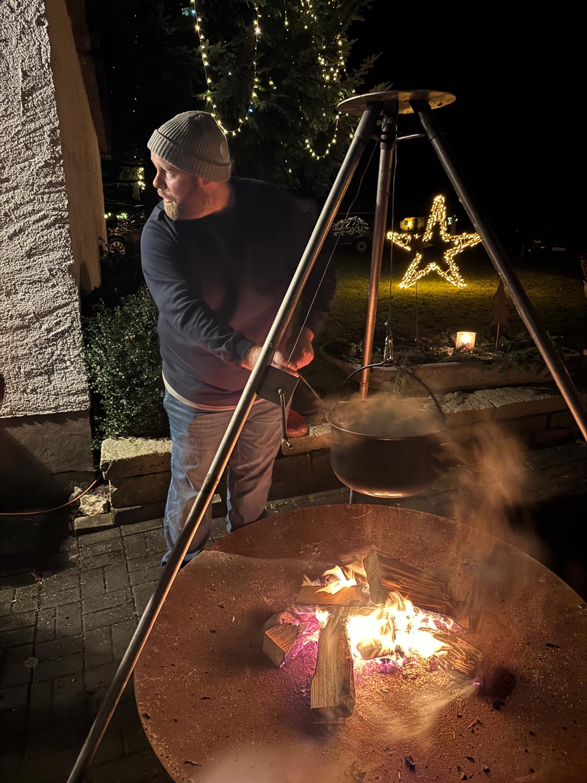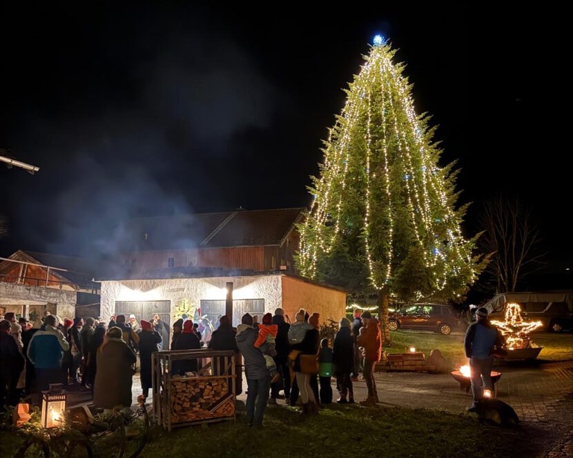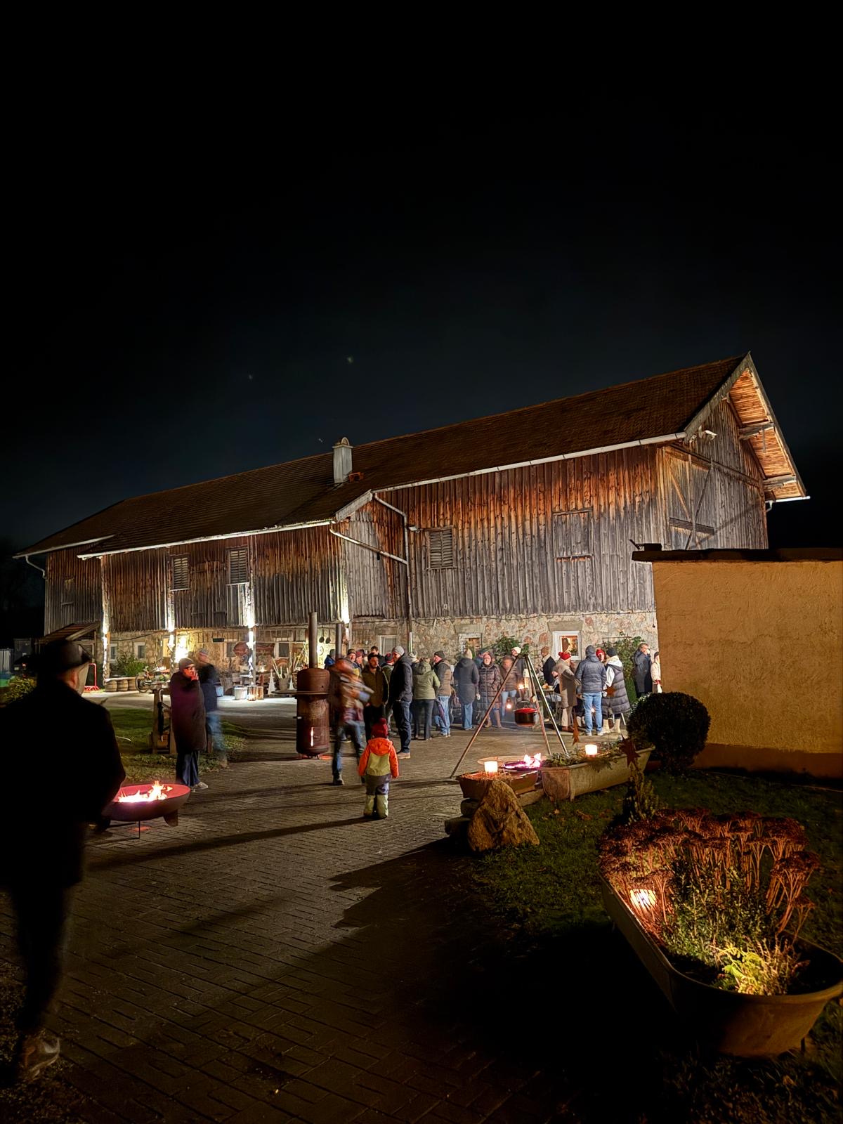Beim Mühlner empfingen ein wunderschön beleuchteter Baum und Feuerstellen die vielen Gäste, die mit Gulaschsuppe, Plätzchen und wamen Getränken verwöhnt wurden.