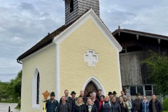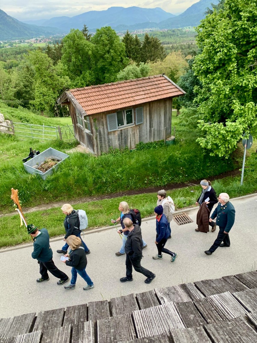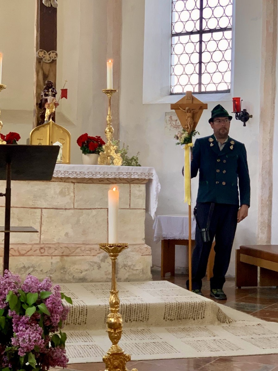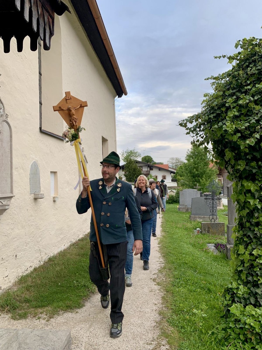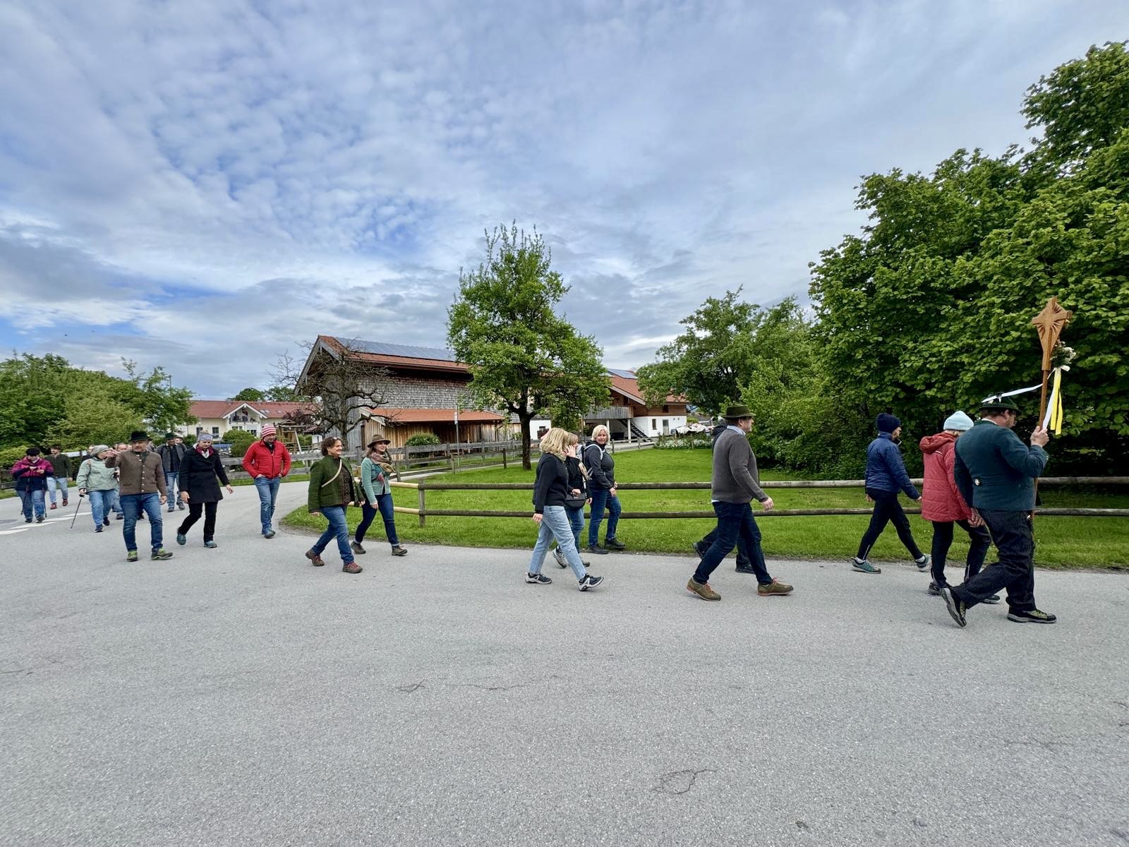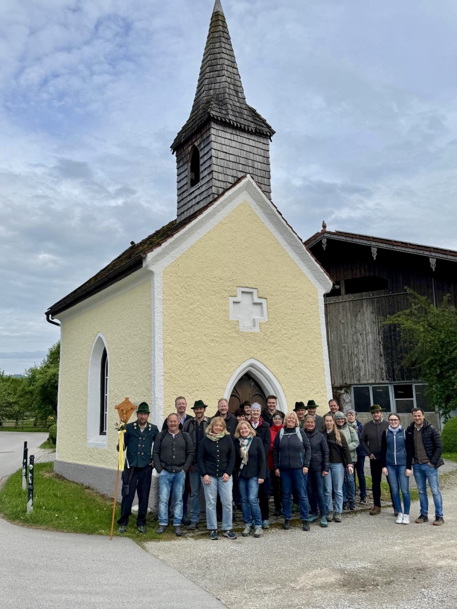 Die traditionelle Maiandacht der Feldwieser Trachtler fand im Gaufest-Dahoam-Jahr 2025 auf dem Westerbuchberg statt. Knapp 50 Feldwieser Trachtler jeden Alters machten sich dazu von der Feldwieser Kapelle aus auf den Weg in die St.Peter und Paul Kirche und baten gemeinsam mit Diakon Heiko Jung um ein gutes, unfallfreies Gaufest. Dazu wurde unterwegs der Rosenkranz der freudenreichen Geheimnisse gebetet. Diakon Jung stellte die sehr schöne Maiandacht unter den Gedanken „Mit Maria auf dem Weg“ und die Feldwieser Alphornbläser sowie Monika Hiendl mit der Harfe und Thomas Hiendl mit der Ziach umrahmten musikalisch.