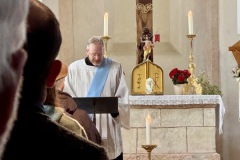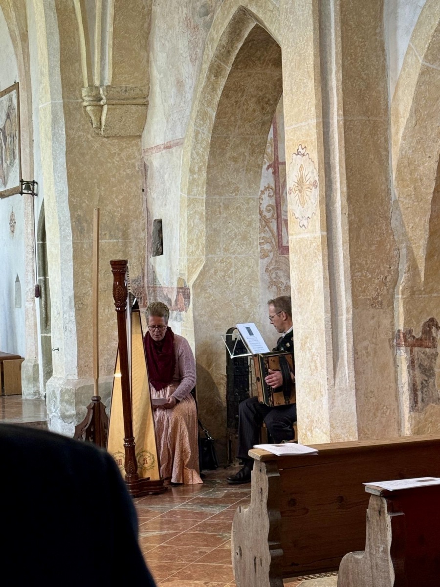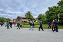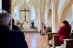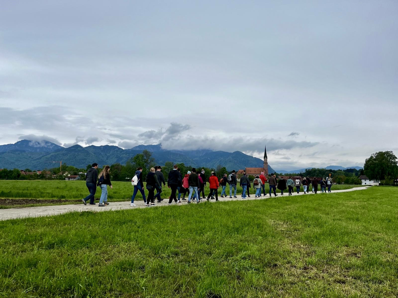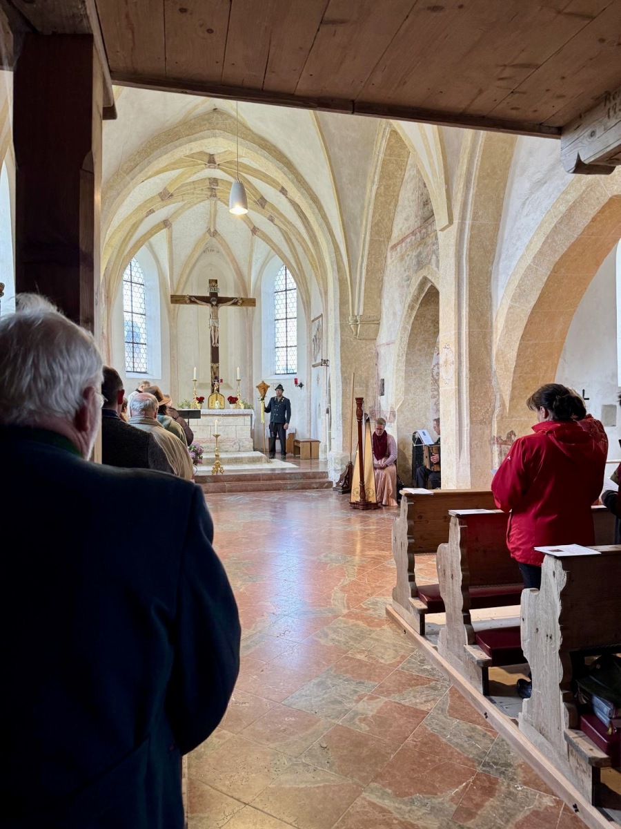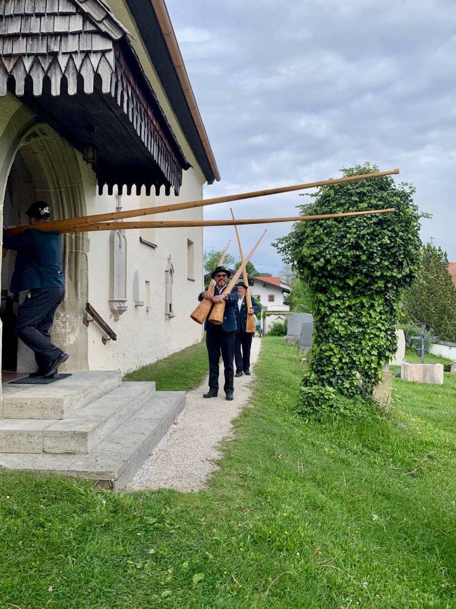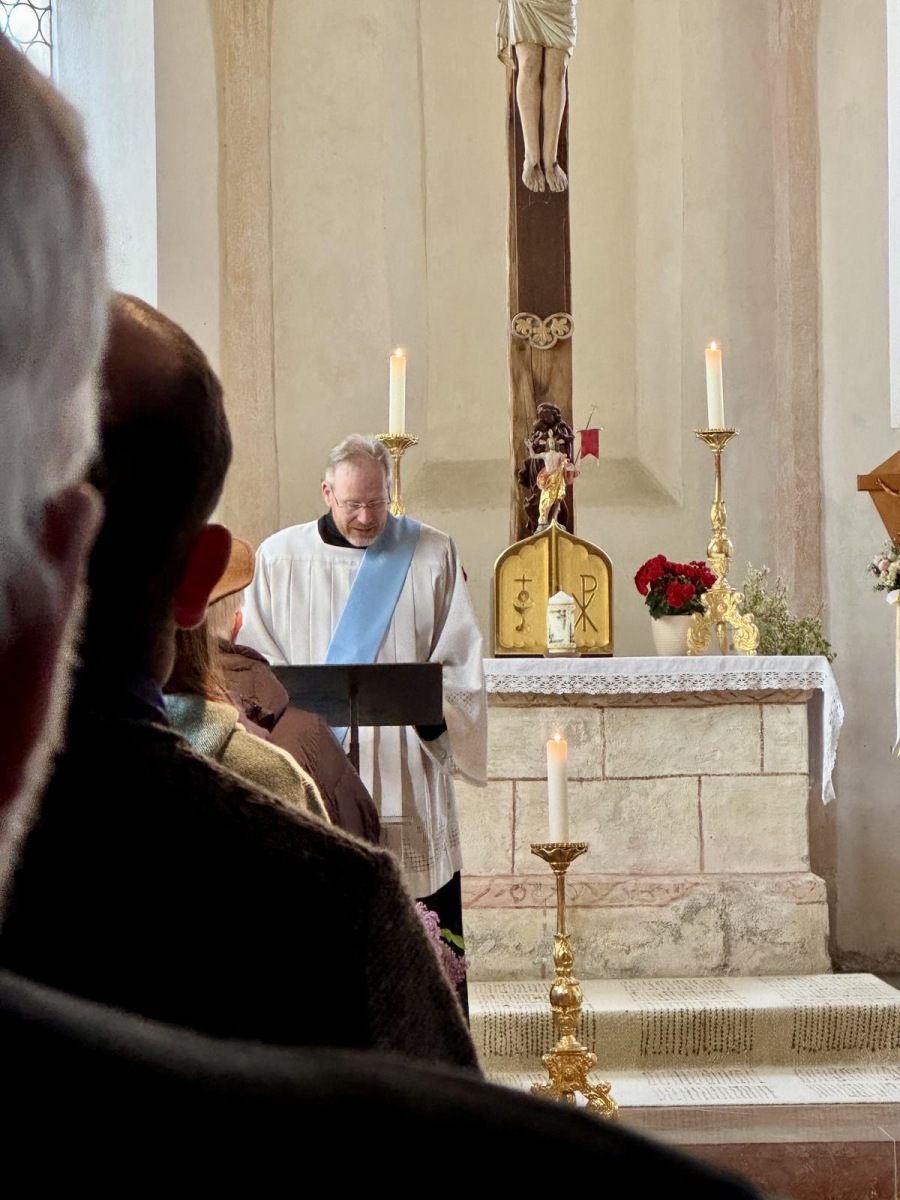Die traditionelle Maiandacht der Feldwieser Trachtler fand im Gaufest-Dahoam-Jahr 2025 auf dem Westerbuchberg statt. Knapp 50 Feldwieser Trachtler jeden Alters machten sich dazu von der Feldwieser Kapelle aus auf den Weg in die St.Peter und Paul Kirche und baten gemeinsam mit Diakon Heiko Jung um ein gutes, unfallfreies Gaufest. Dazu wurde unterwegs der Rosenkranz der freudenreichen Geheimnisse gebetet. Diakon Jung stellte die sehr schöne Maiandacht unter den Gedanken „Mit Maria auf dem Weg“ und die Feldwieser Alphornbläser sowie Monika Hiendl mit der Harfe und Thomas Hiendl mit der Ziach umrahmten musikalisch.