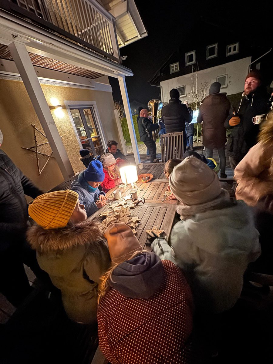 Sie hatten eingeladen, den Stern am Balkon aufgehängt und Schilder aufgestellt, warme Getränke und kleine Köstlichkeiten vorbereitet. Dazu spielten die Weisenbläser auf der Terrasse und Steffi, Rosa und Hannes lasen die Geschichte der Tiere vor, während Ludwig sich um das Feuer im Häuschen kümmerte.