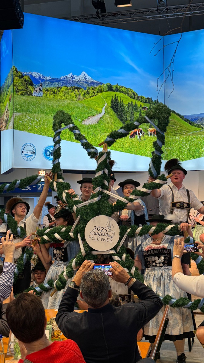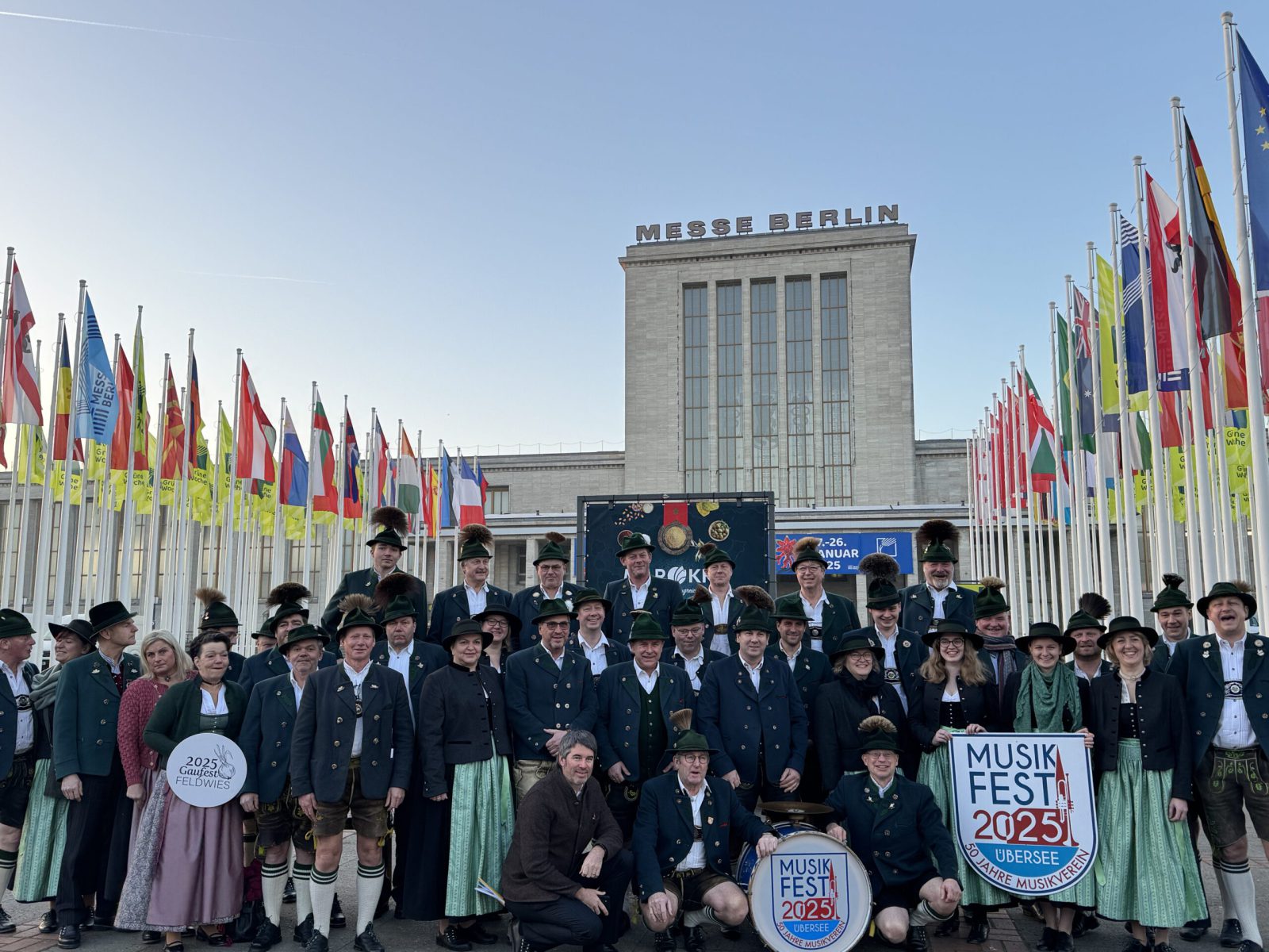 Im Rahmen des Überseer Traditionssommers fuhren die Feldwieser Trachtler gemeinsam mit der Blasmusik Übersee, Bürgermeister Herbert Strauch mit Ehefrau Ines und Tourist-Info-Leiter Mike Wielandner nach Berlin und bereicherten mit ihren Plattlern und Tänzen die Grüne Woche. In der Bayernhalle durften sie den Gottesdienst und das Programm am Sonntagmorgen (mit)gestalten und erfreuten damit die vielen Besucher sichtlich. Die Trachtler warben fürs Gaufest und verteilten u.a. Postkarten und Bierfuizl.