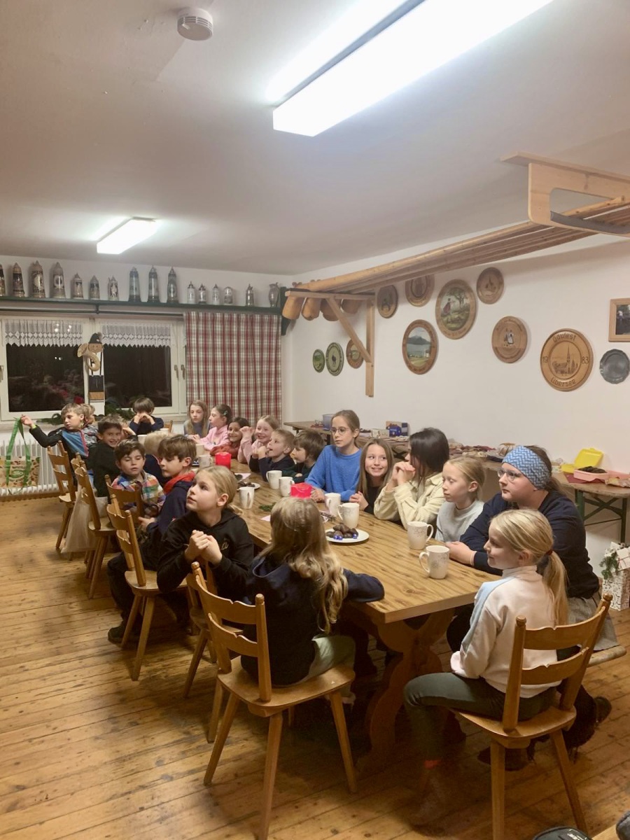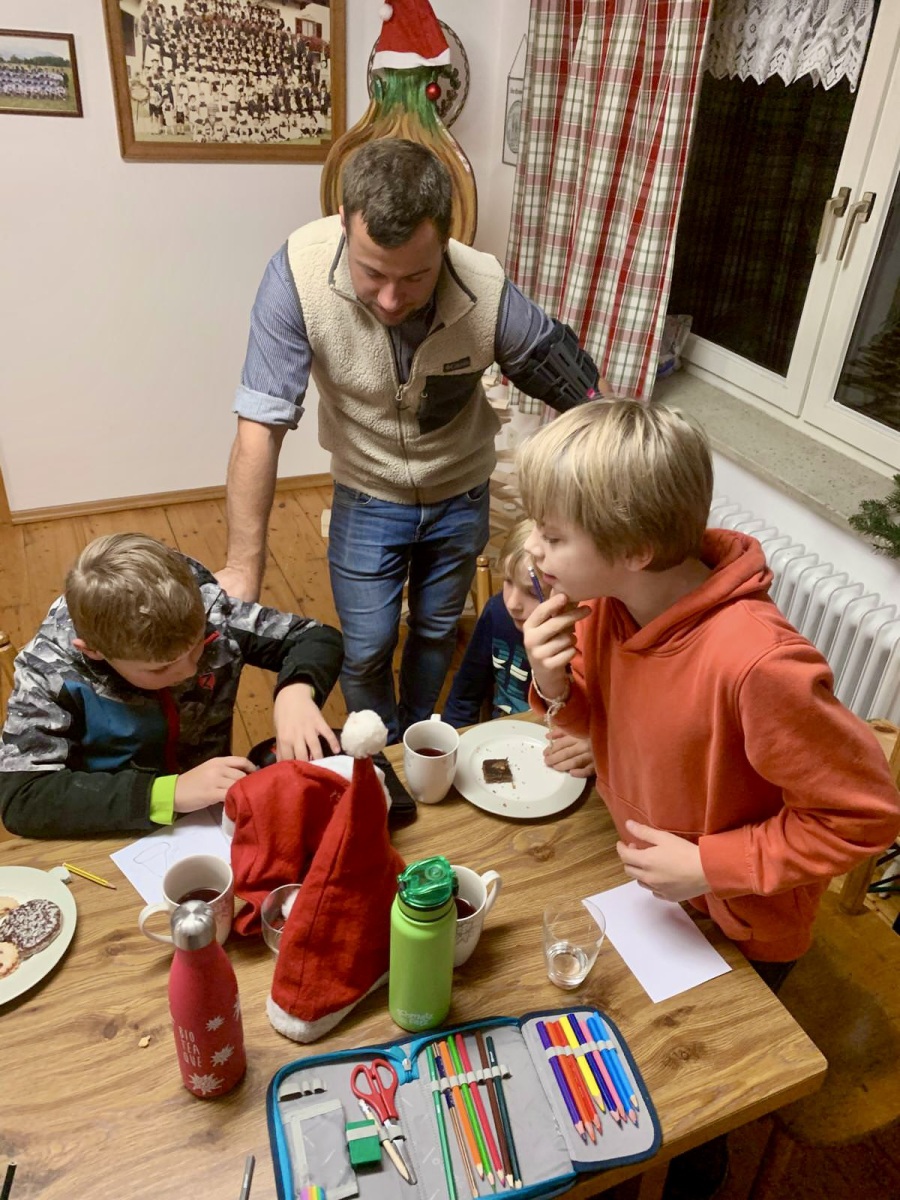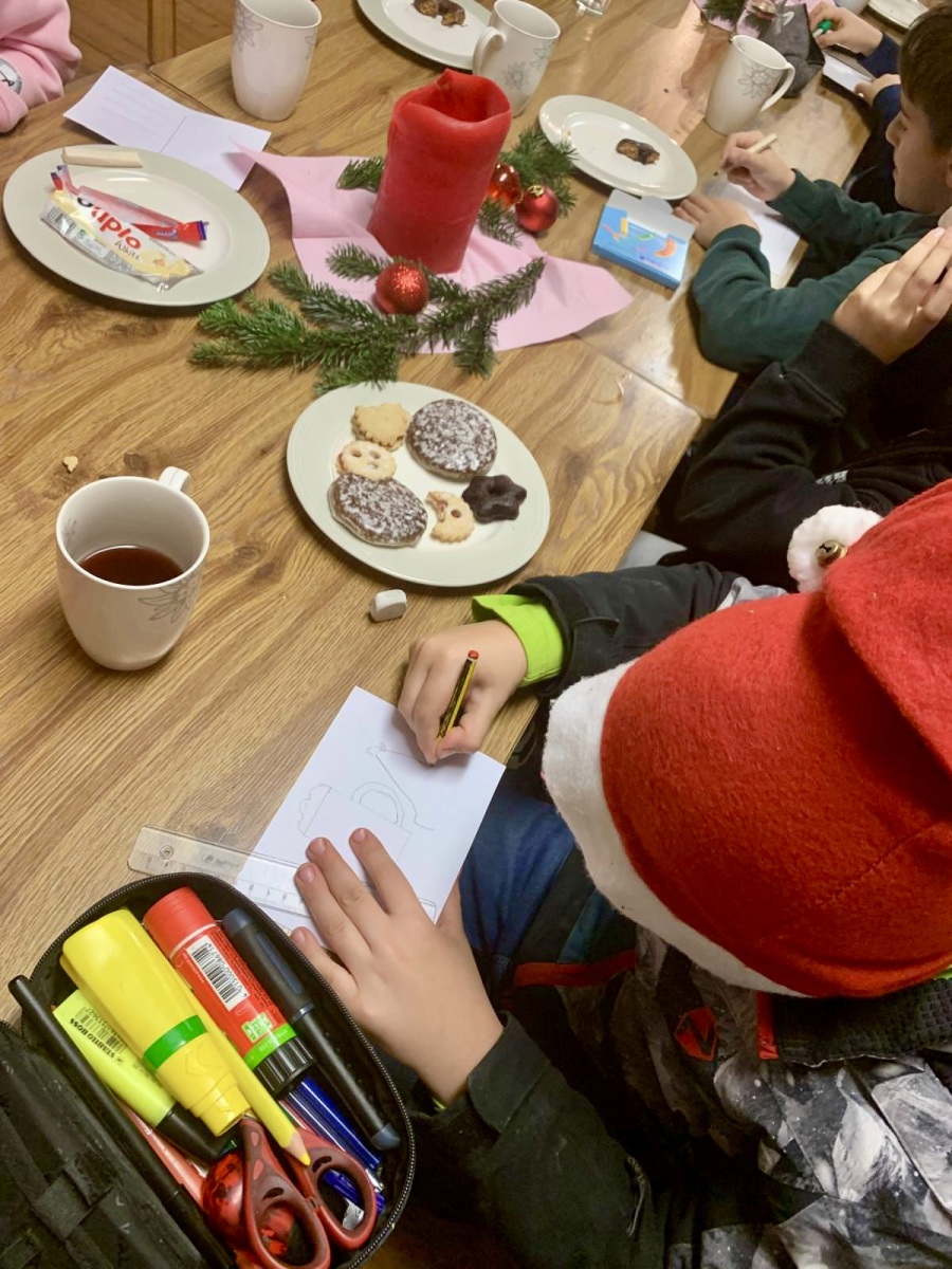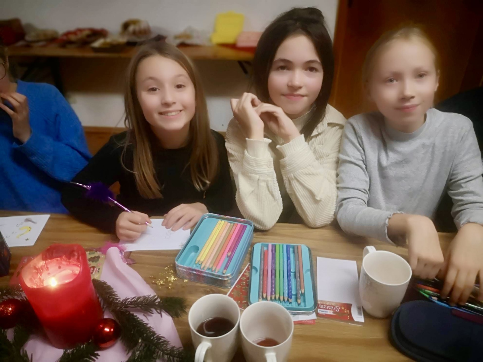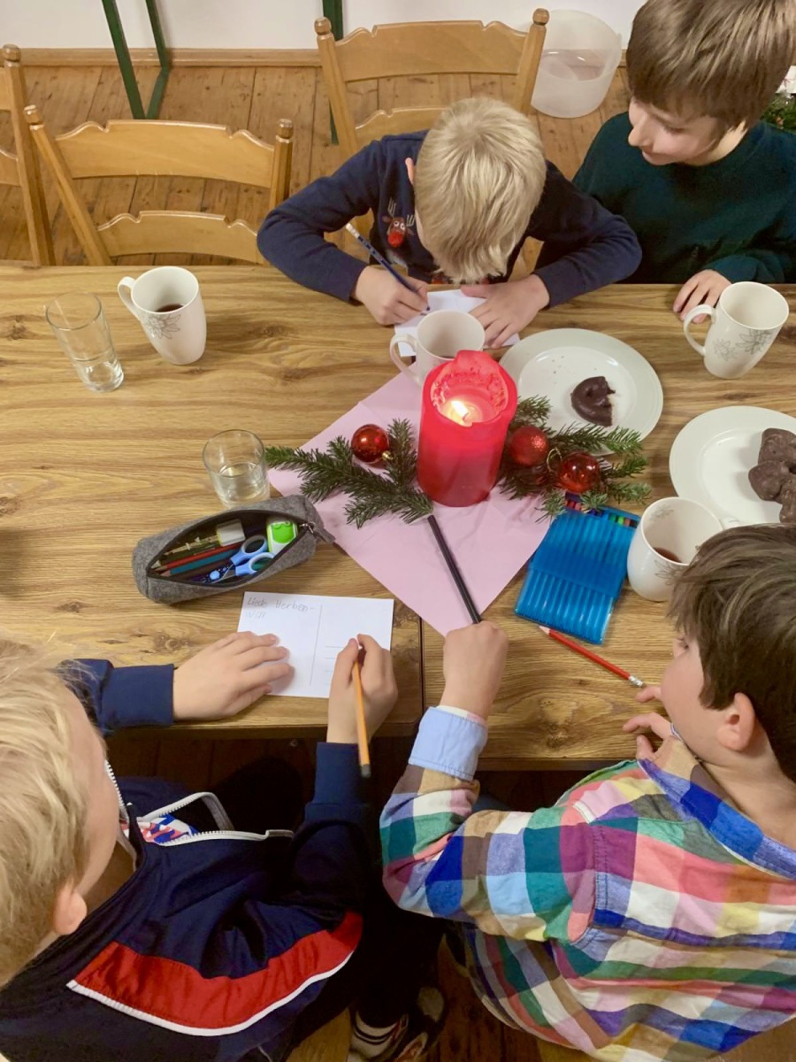 Neben köstlichsten Plätzchen, Punsch und einer kleinen warmen Brotzeit wurde gesungen und viele Weihnachtskarten für Pfarrer, Polizei, Bürgermeister, … und sogar in unsere Partnerstadt Monte San Biagio geschrieben und selbst bemalt.