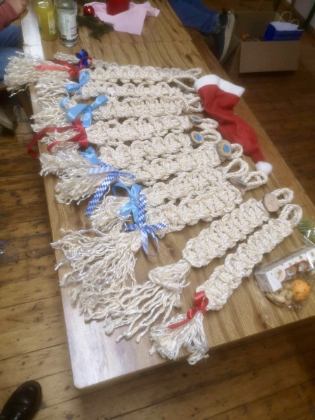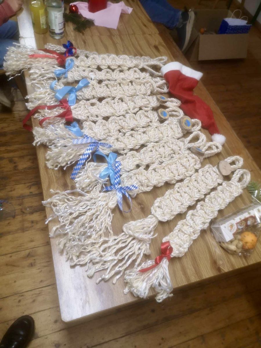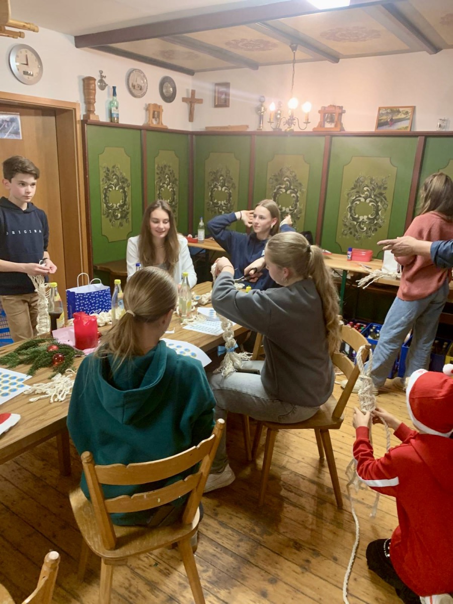 Die Jugendgruppe traf sich im Anschluss für gut zwei Stunden. Da die Feldwieser Weihnachtsgrüße von den Kindern schon geschrieben wurden, bastelte der Großteil der Jugendlichen schöne Makrameezöpfe um ihre schon vorhandenen und die vielen kommenden Zeichen dekorativ daran angesteckt zu sammeln. Zur Stärkung konnten sich die Jugendlichen ihren Abendschmaus nach dem eigenen Geschmack zusammenstellen.