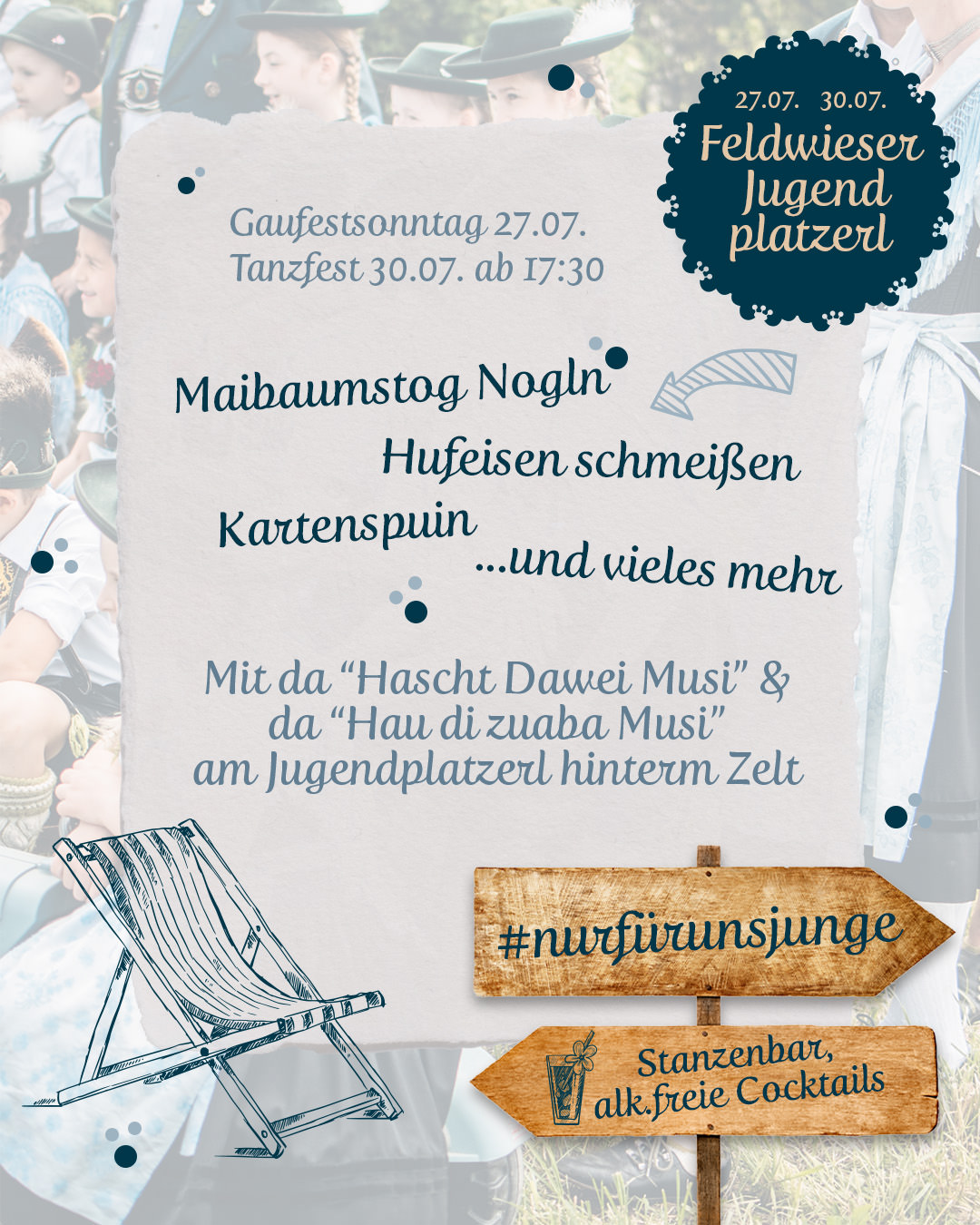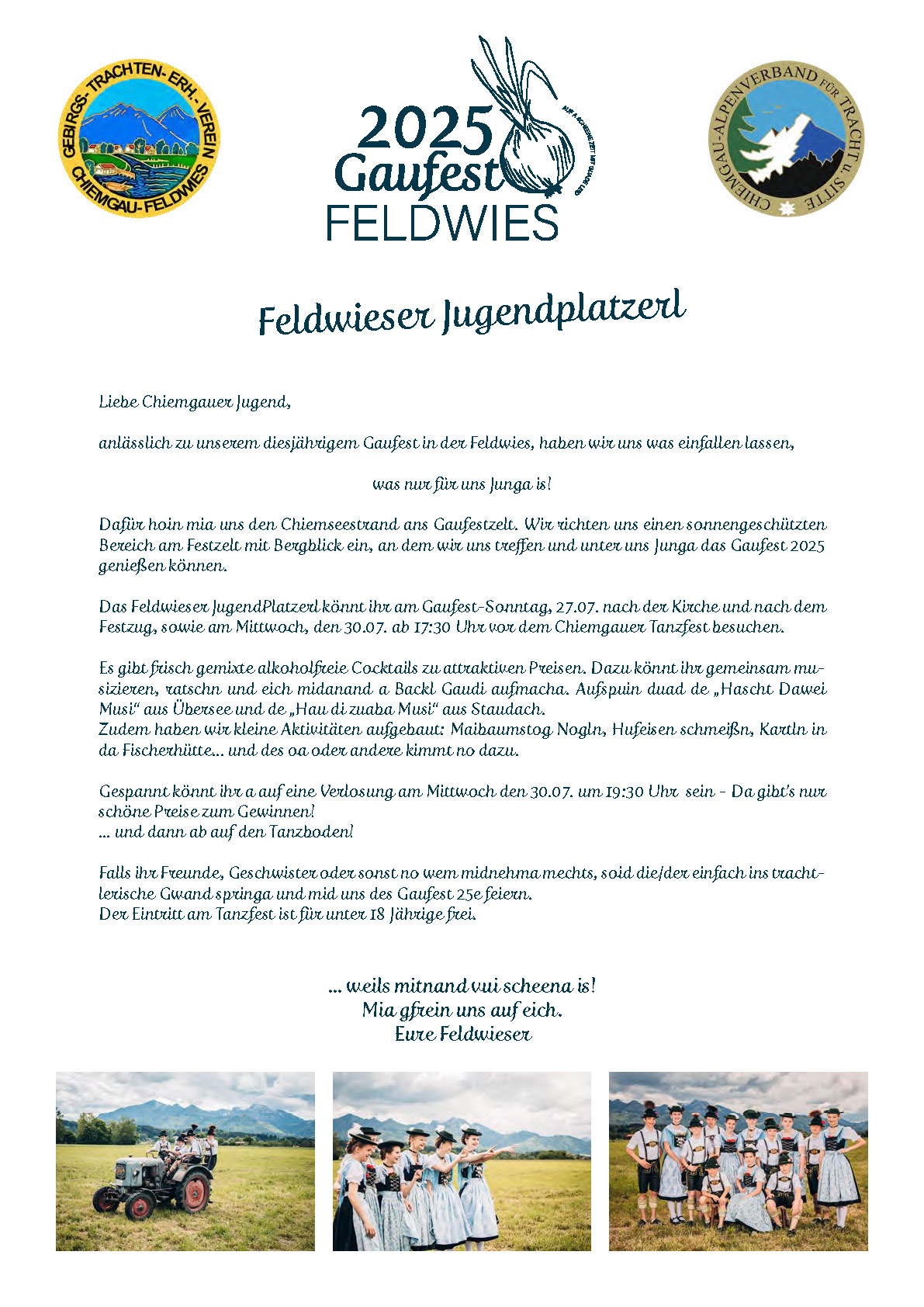 Neues zum Gaufest, Jugendplatzerl, D`Feldwieser Roas, zukünftige Titelseite Gemeindezeitung 20. Juli 202520. Juli 2025Anna GnadlGaufest 2025 / Gemeinsame Gaufestvorbereitungen