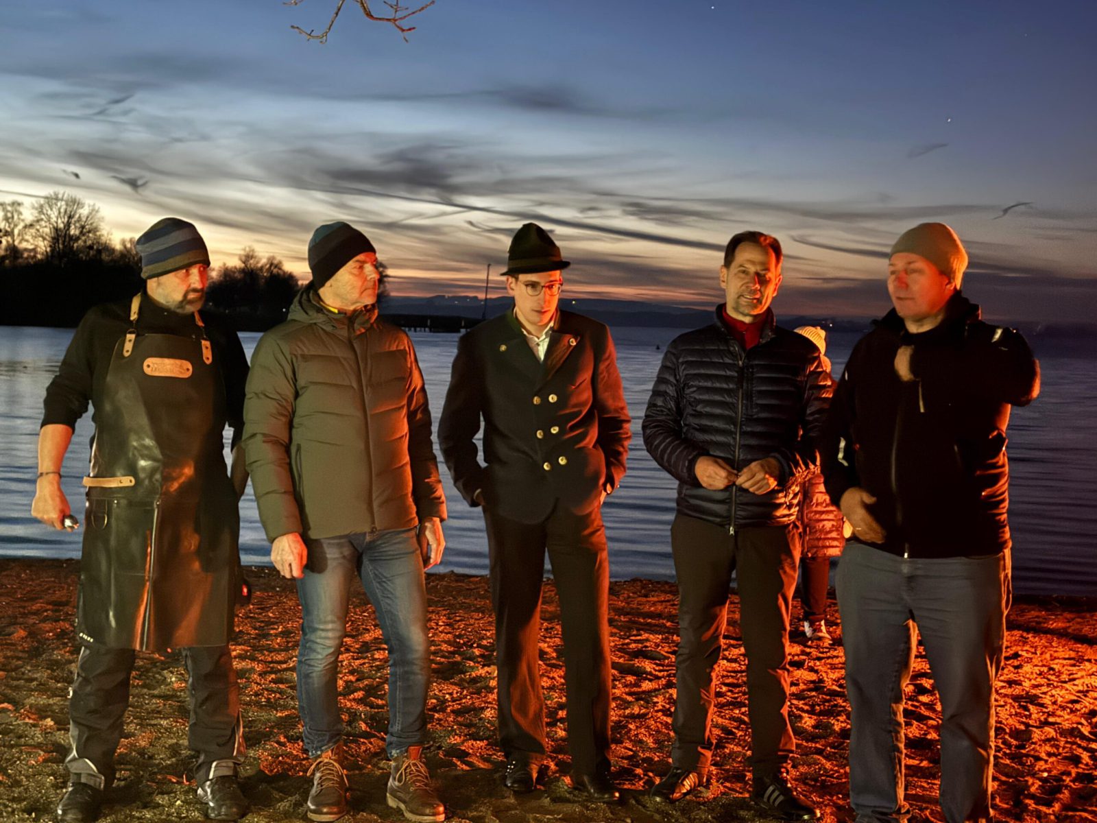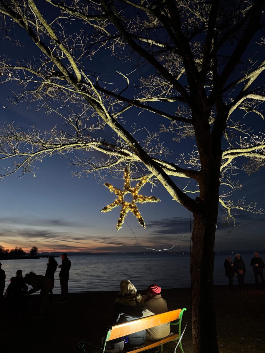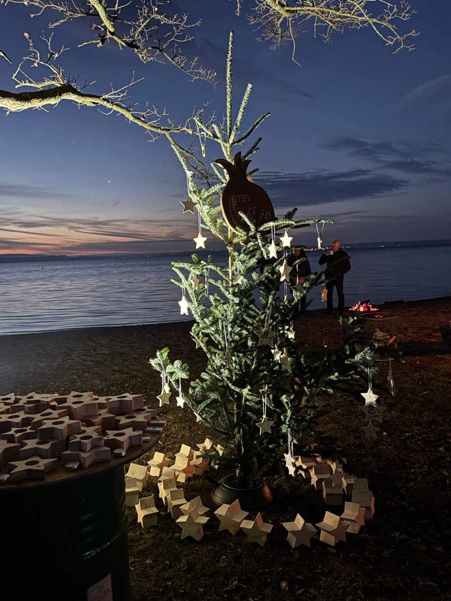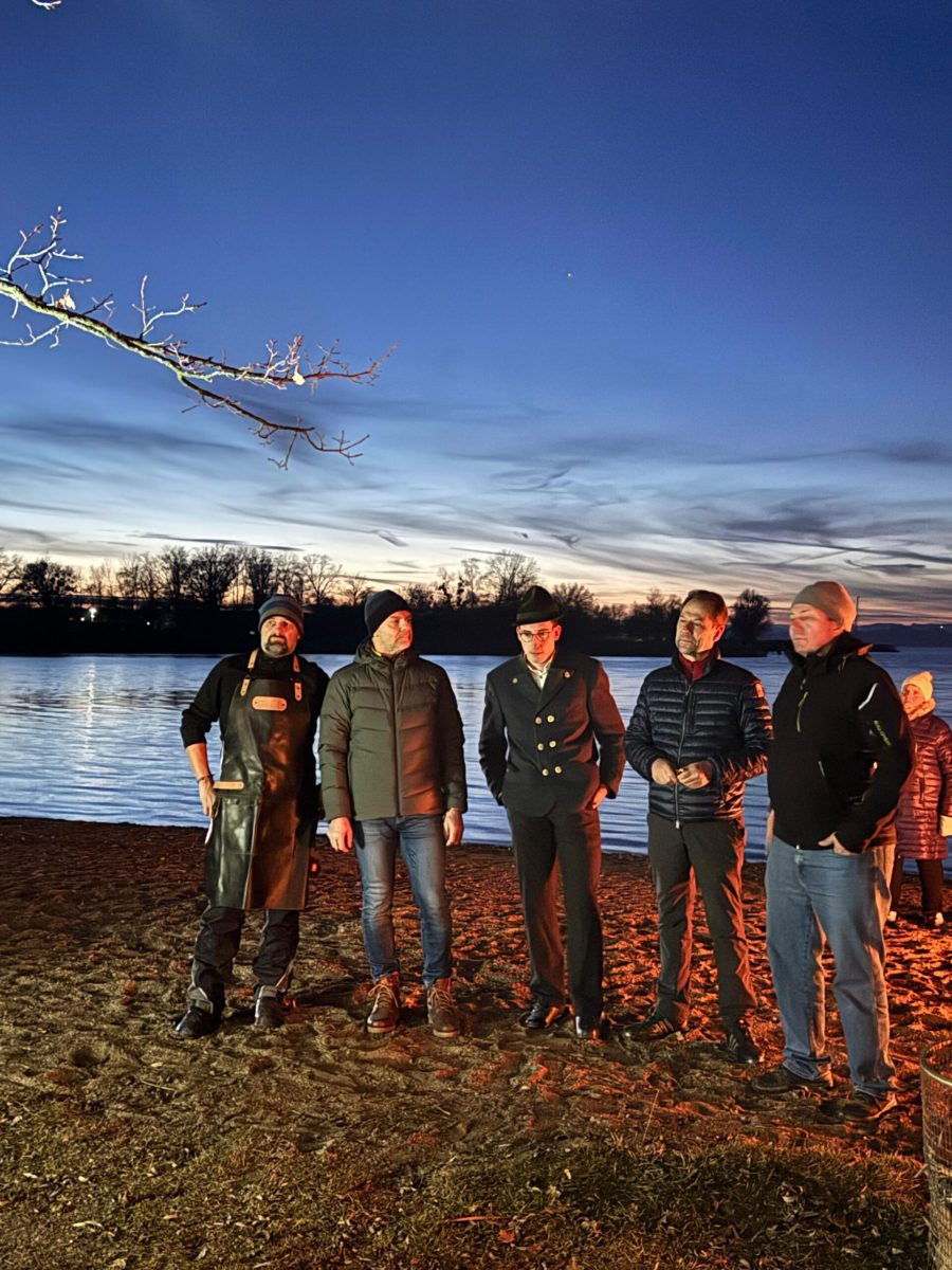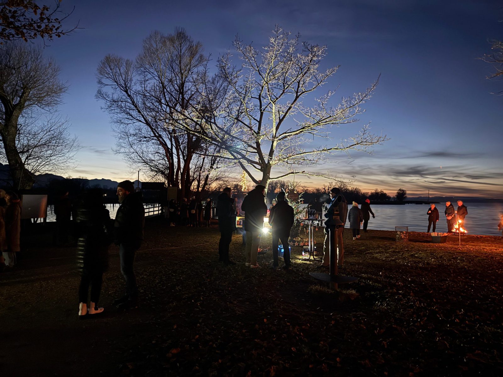 Schöner hätte das Wetter für den Abend am See nicht sein können! Die (spätberufenen) Feldwieser Plattler der Königsklasse hatten eingeladen und diese Einladung wurde sehr gerne angenommen: Es gab Bosna mit unterschiedlichen, selbstgemachten Soßen – v.a. „Sweet Tina“ schmeckte hervorragend, gestacheltes Bier und Glühwein, Richard und Vitus Tanner akzentuierten den Abend musikalisch und spielten, am Dampfersteg stehend, Weisen, Martin trug auswendig die Heilige Nacht von Ludwig Thoma vor und aus Holz ausgeschnittene Sterne trugen Kerzenlicht in die Nacht. Auch der Feldwieser Stern war dabei und leuchtete neben den Feuerschalen und über dem Christbaum.