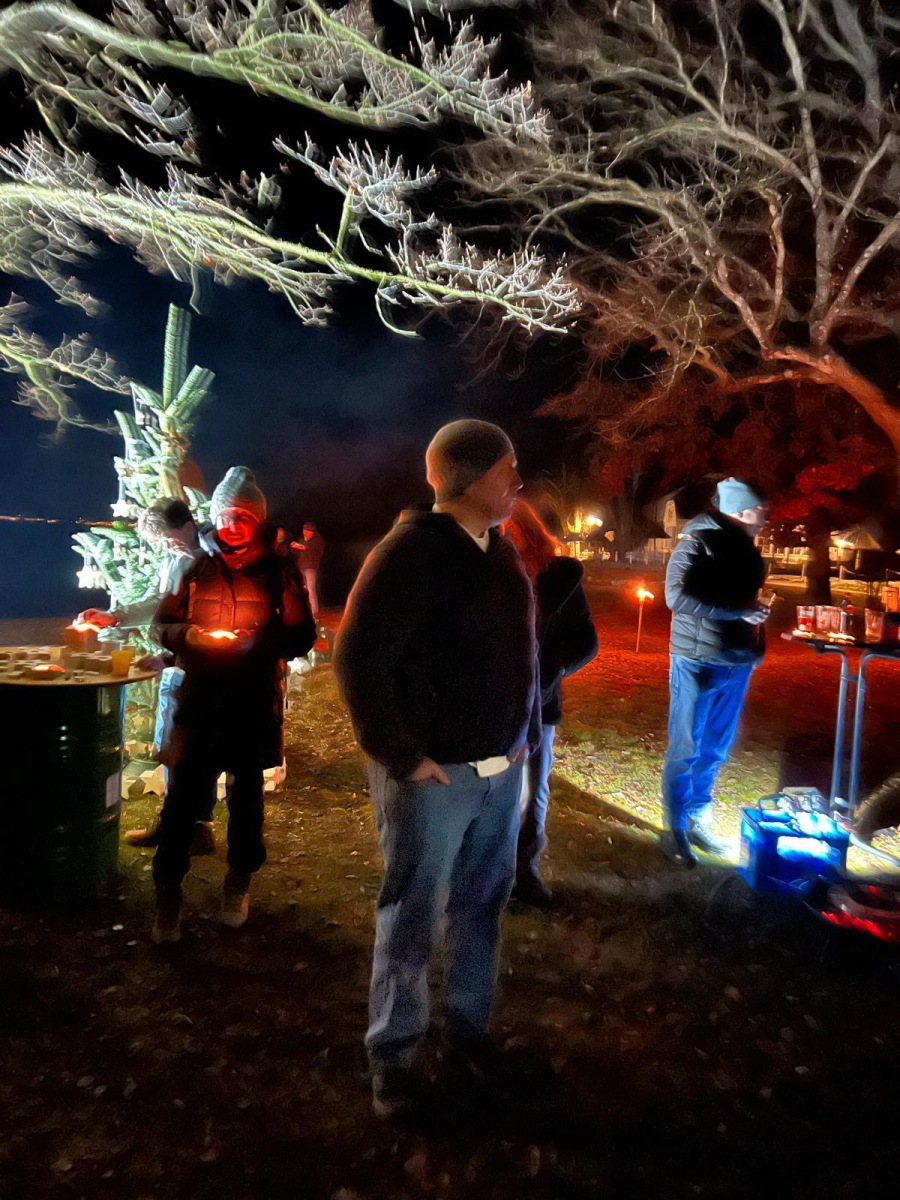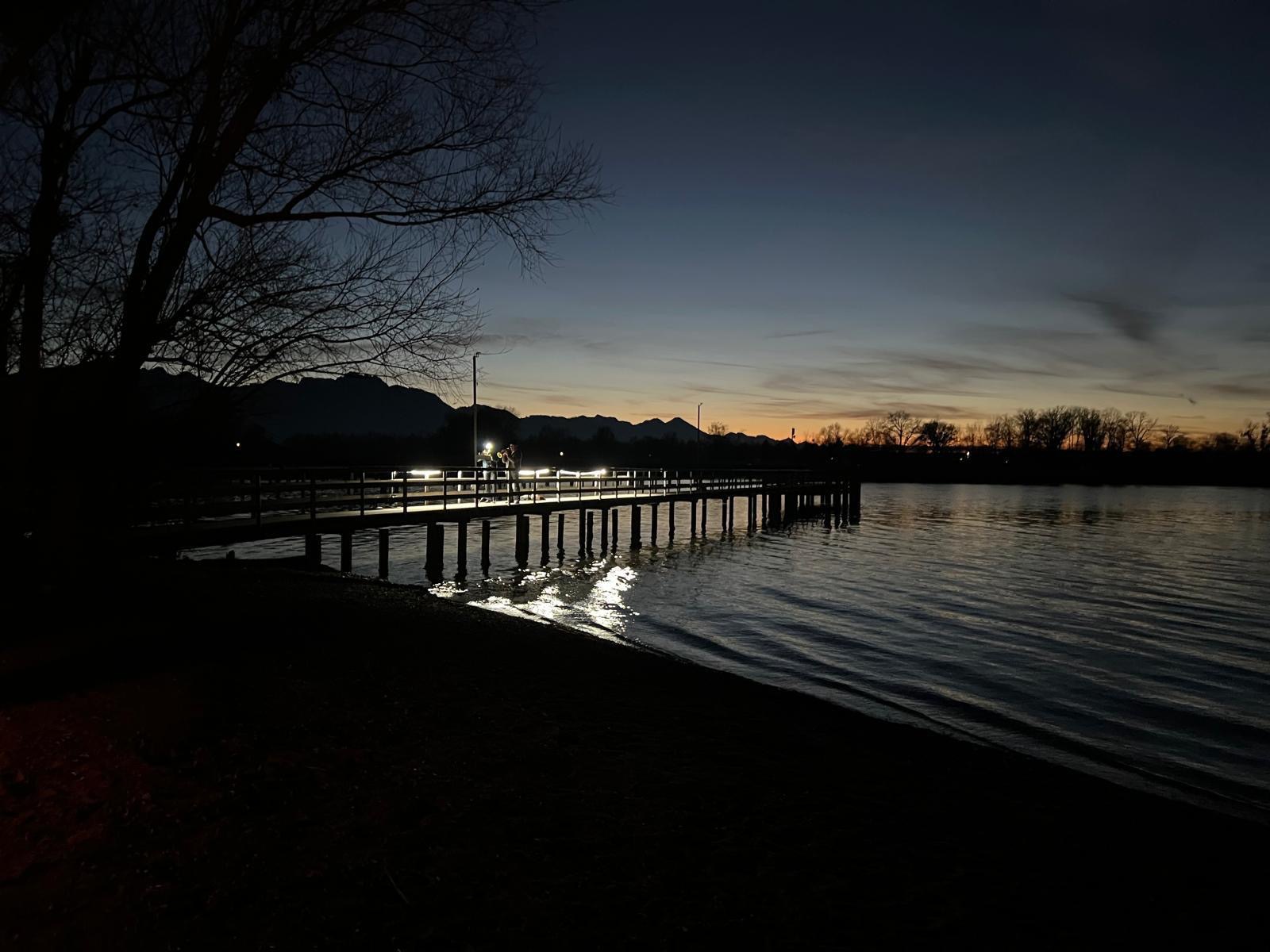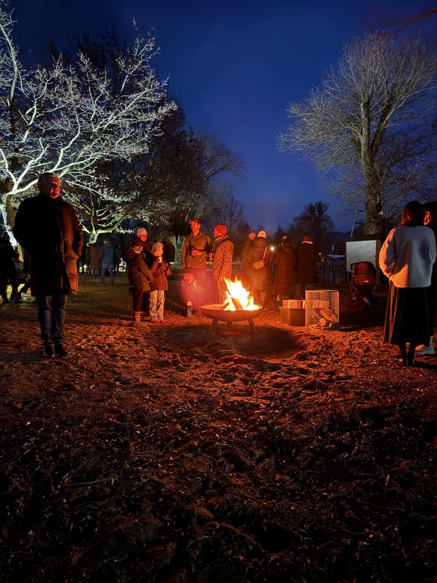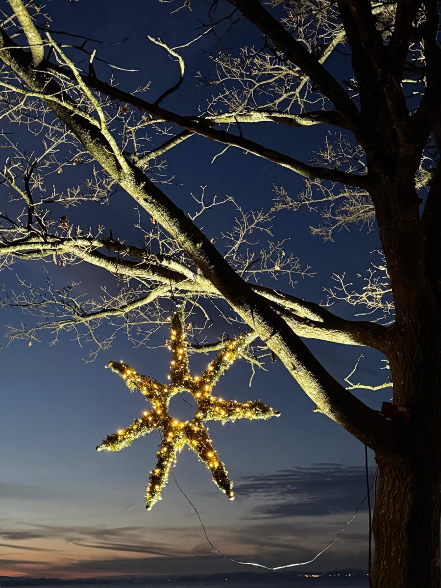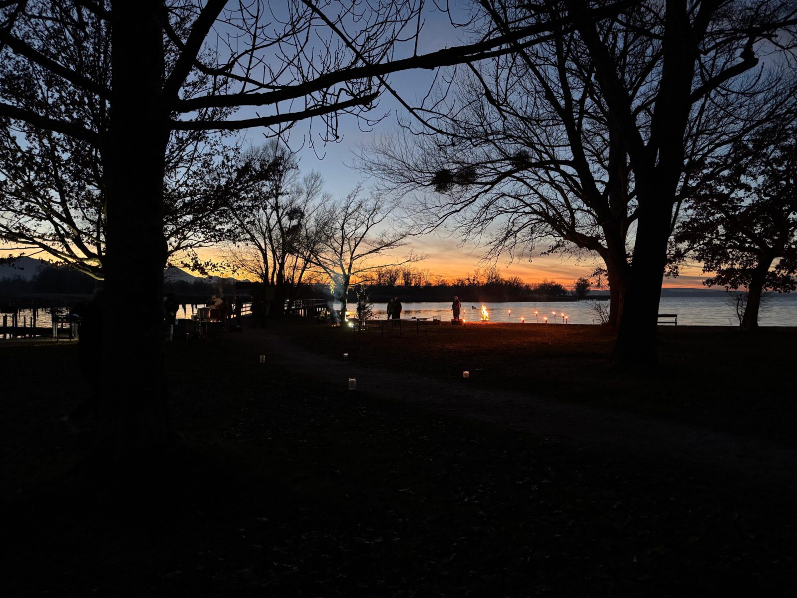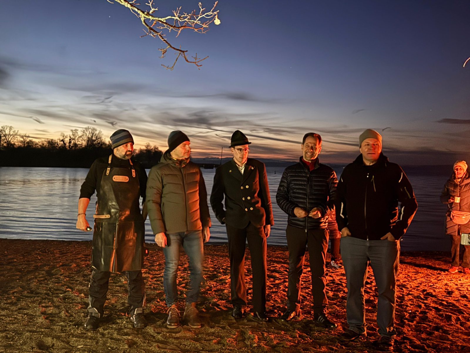 Schöner hätte das Wetter für den Abend am See nicht sein können! Die (spätberufenen) Feldwieser Plattler der Königsklasse hatten eingeladen und diese Einladung wurde sehr gerne angenommen: Es gab Bosna mit unterschiedlichen, selbstgemachten Soßen – v.a. „Sweet Tina“ schmeckte hervorragend, gestacheltes Bier und Glühwein, Richard und Vitus Tanner akzentuierten den Abend musikalisch und spielten, am Dampfersteg stehend, Weisen, Martin trug auswendig die Heilige Nacht von Ludwig Thoma vor und aus Holz ausgeschnittene Sterne trugen Kerzenlicht in die Nacht. Auch der Feldwieser Stern war dabei und leuchtete neben den Feuerschalen und über dem Christbaum.