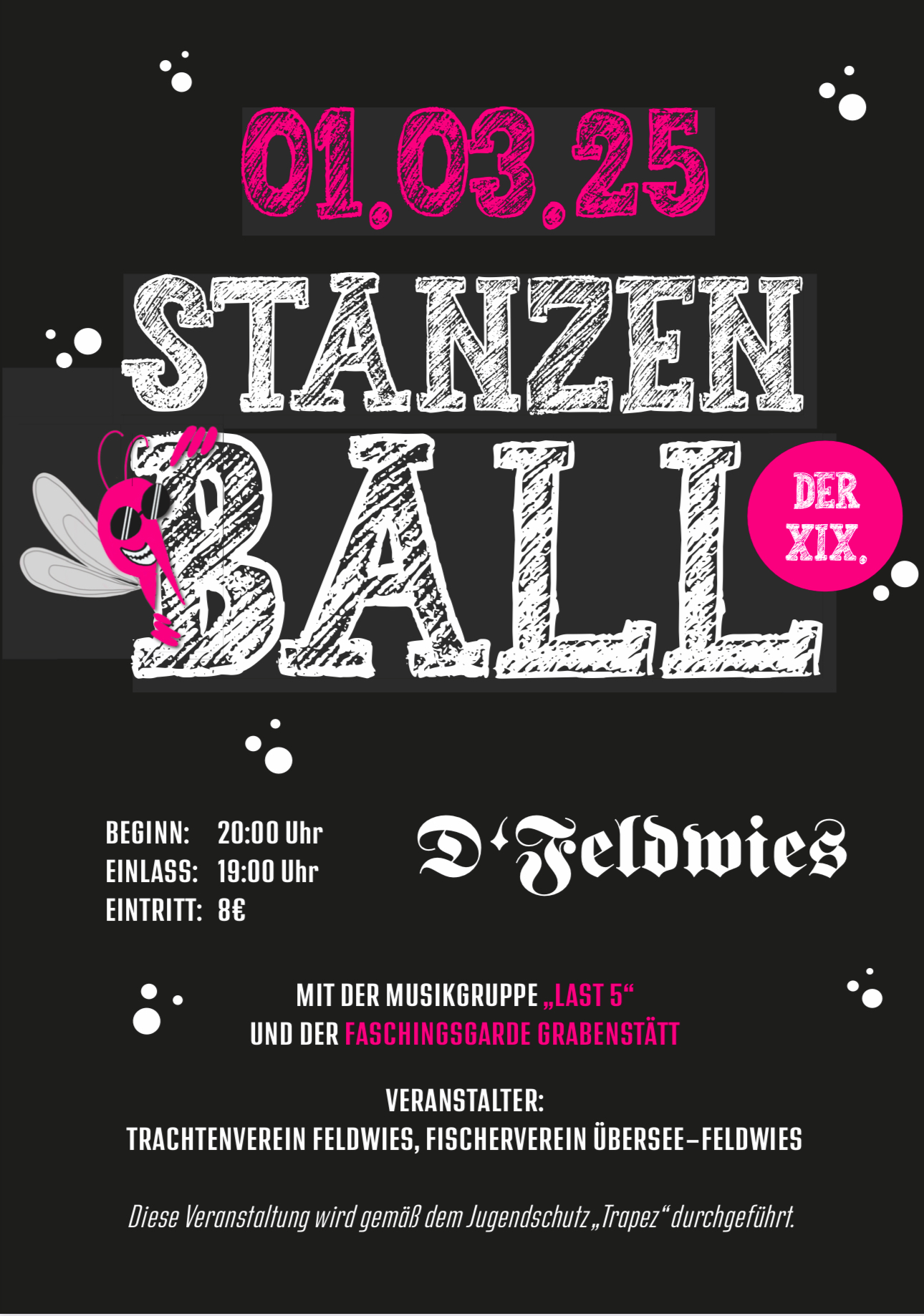 STANZENBALL 30. Januar 202530. Januar 2025Anna GnadlVeranstaltungen BEGINN: 20:00 UhrWO: D‘Feldwies EINLASS: 19:00 UhrEINTRITT: 8 €