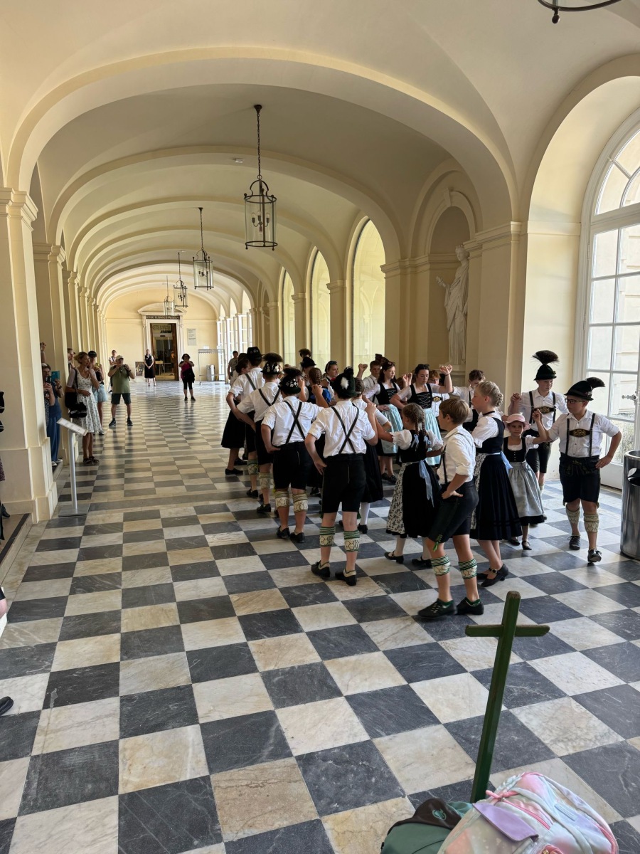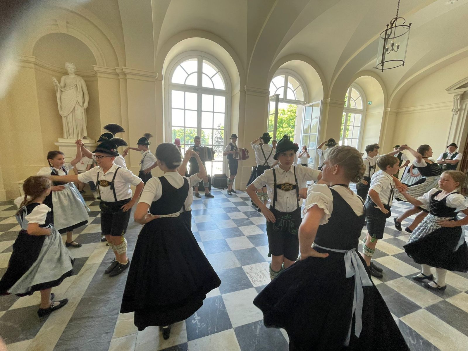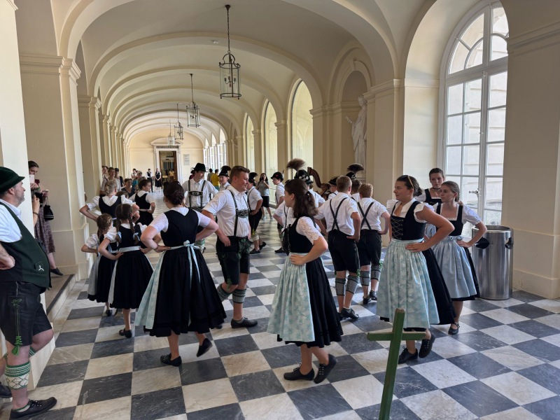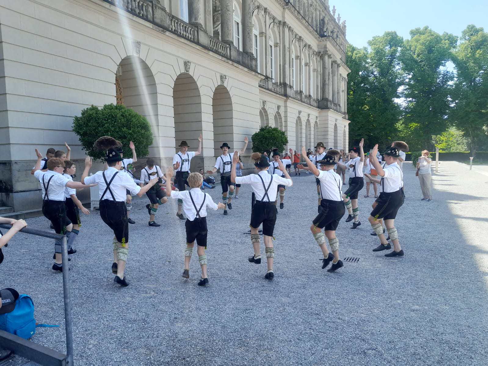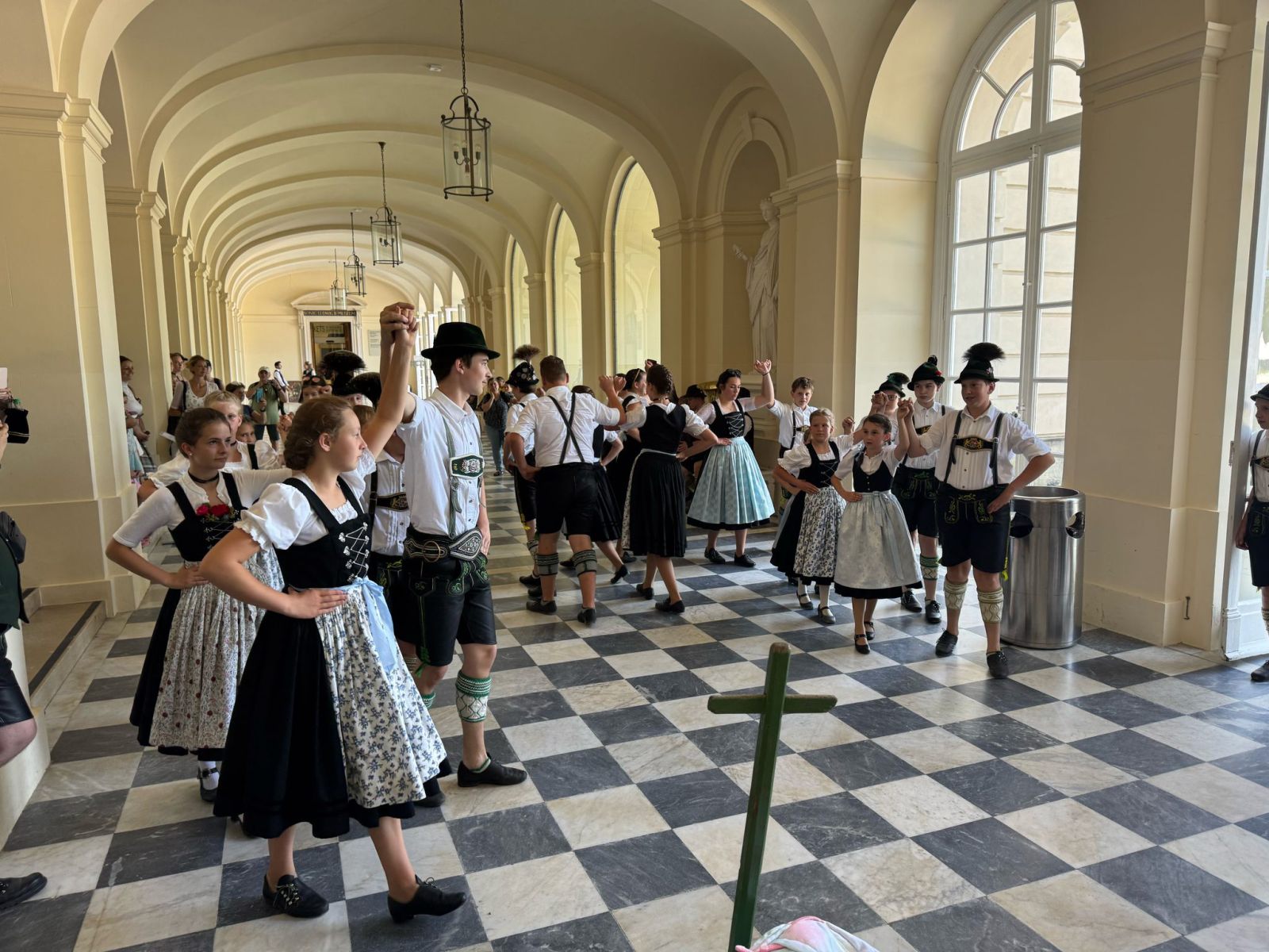 Im Schloss Herrenchiemsee angekommen, konnten es sich die jungen Trachtler nicht verkneifen, bis zur Schloss Führung vor und im Schloss mit einen stattlichen Gemeinschaftstanz und ein paar flotten Plattlern die Wartezeit zu überbrücken.