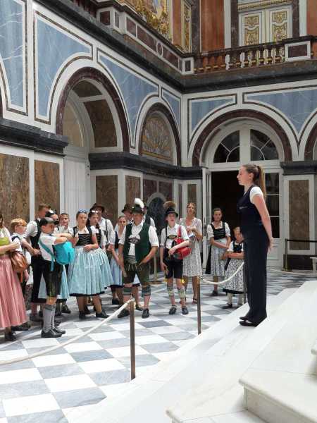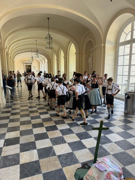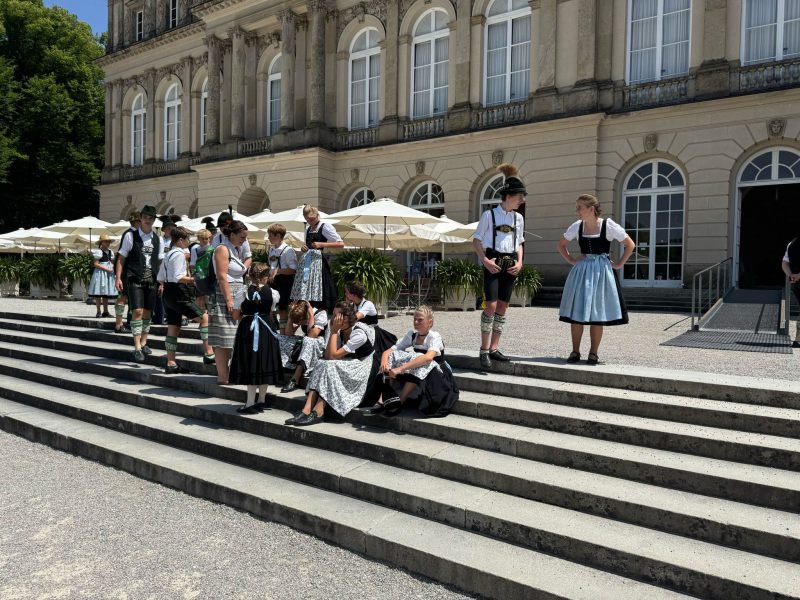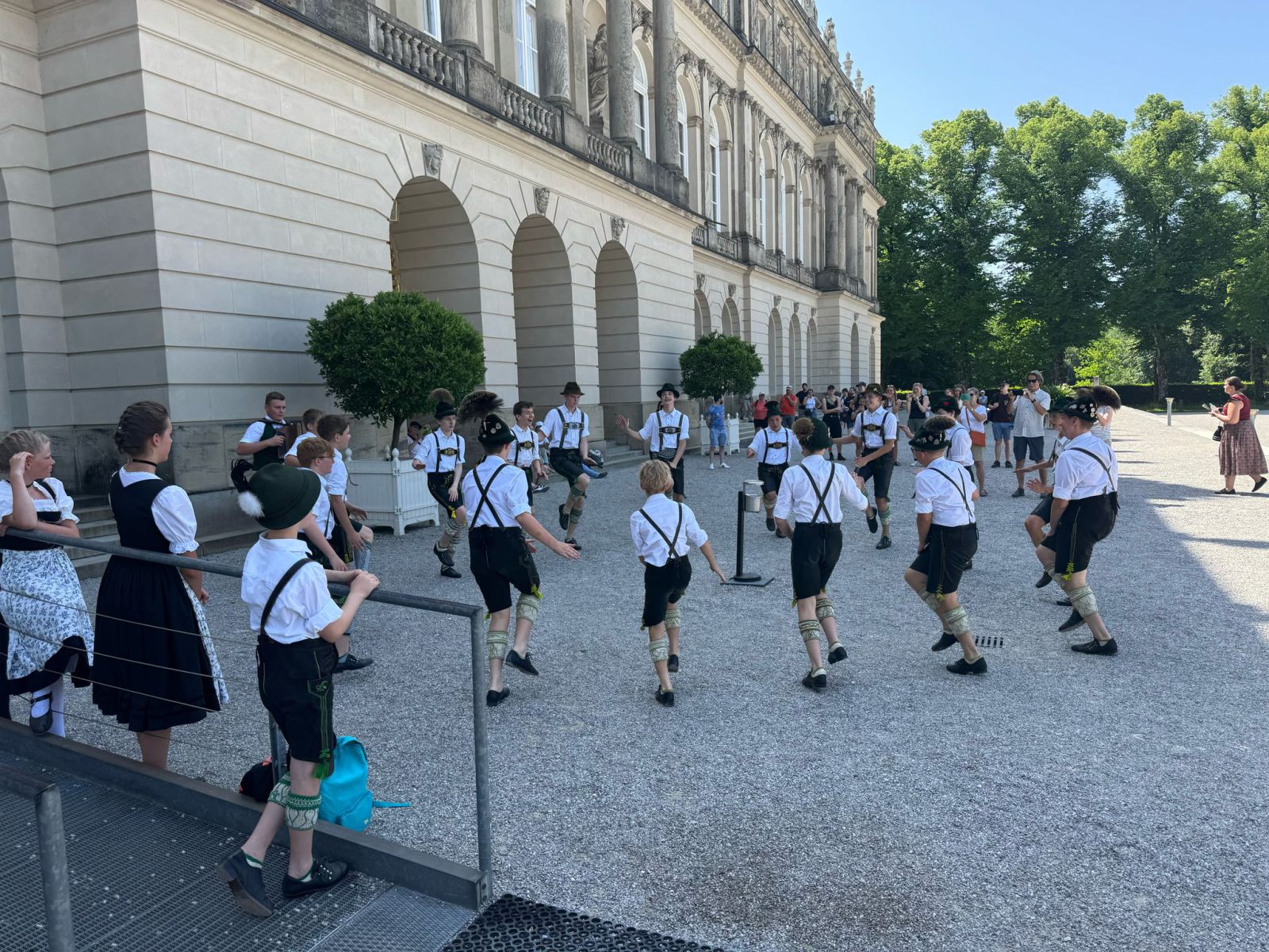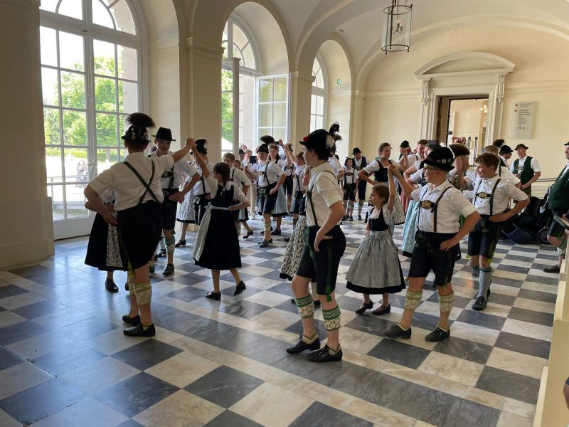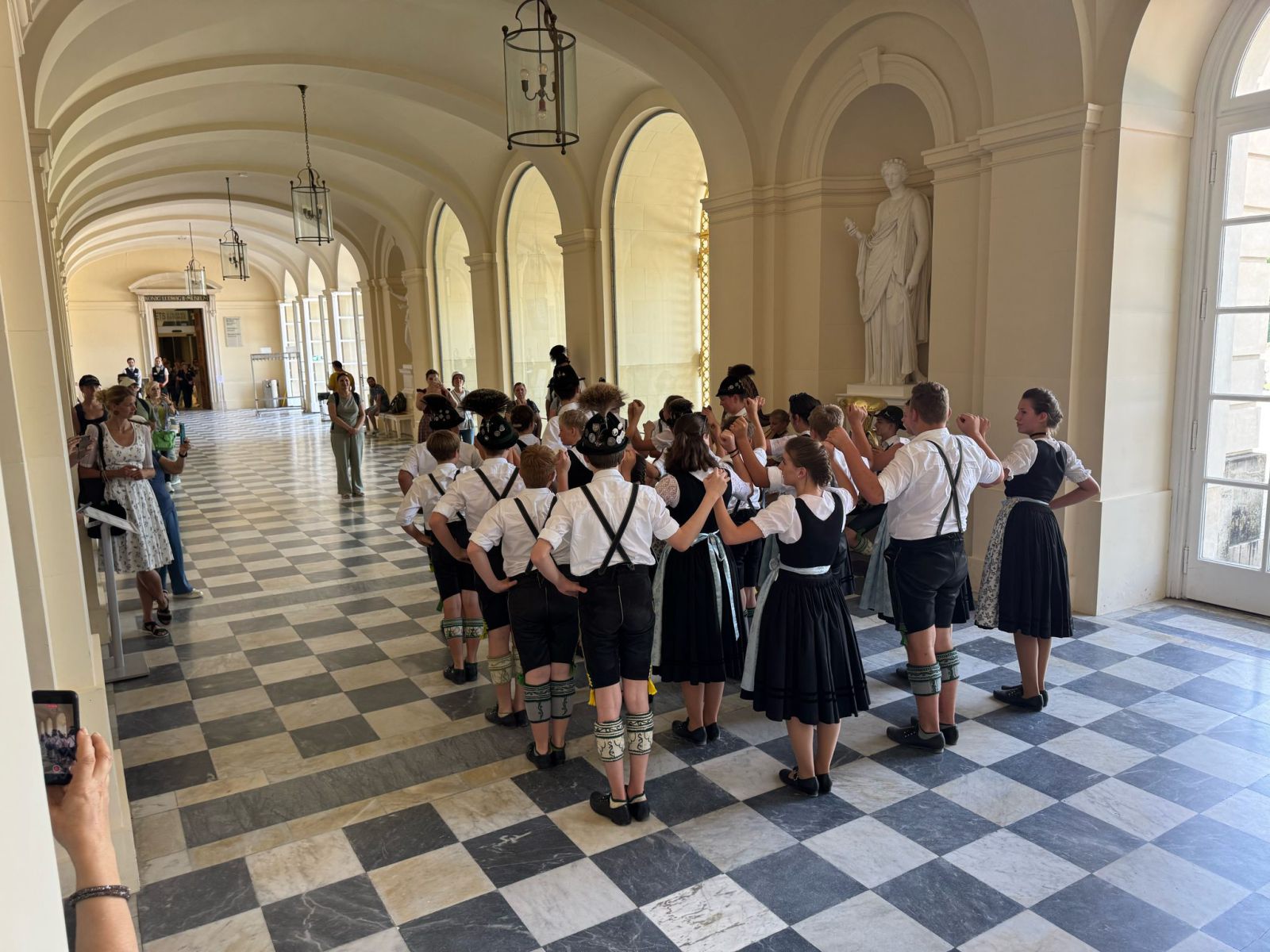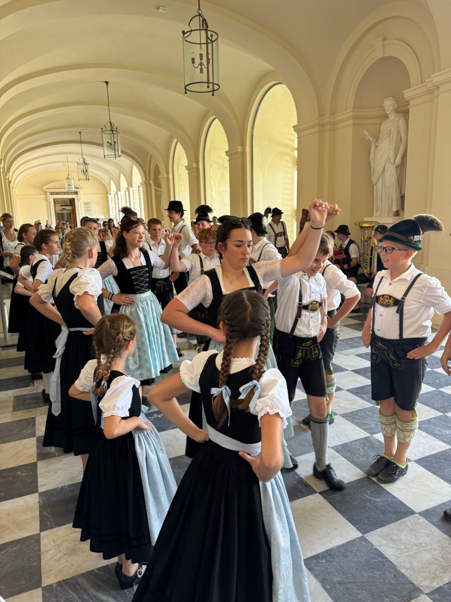 Im Schloss Herrenchiemsee angekommen, konnten es sich die jungen Trachtler nicht verkneifen, bis zur Schloss Führung vor und im Schloss mit einen stattlichen Gemeinschaftstanz und ein paar flotten Plattlern die Wartezeit zu überbrücken.