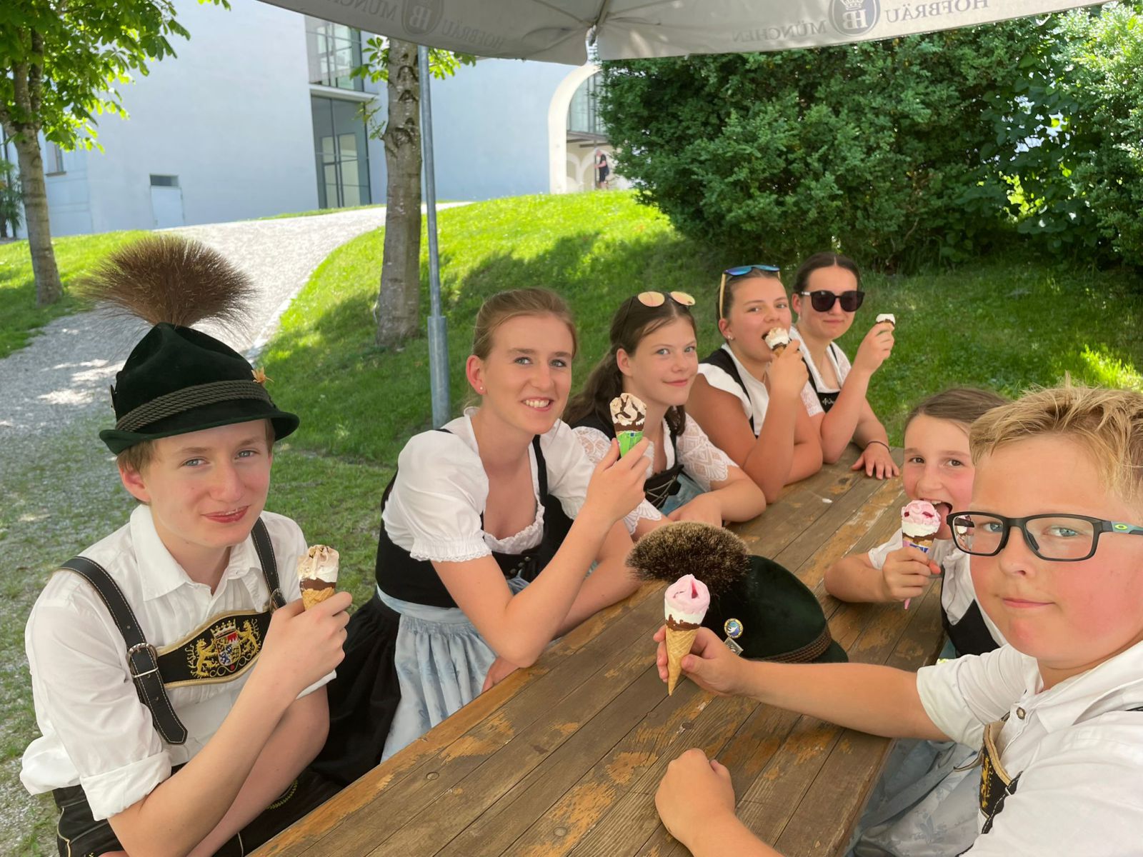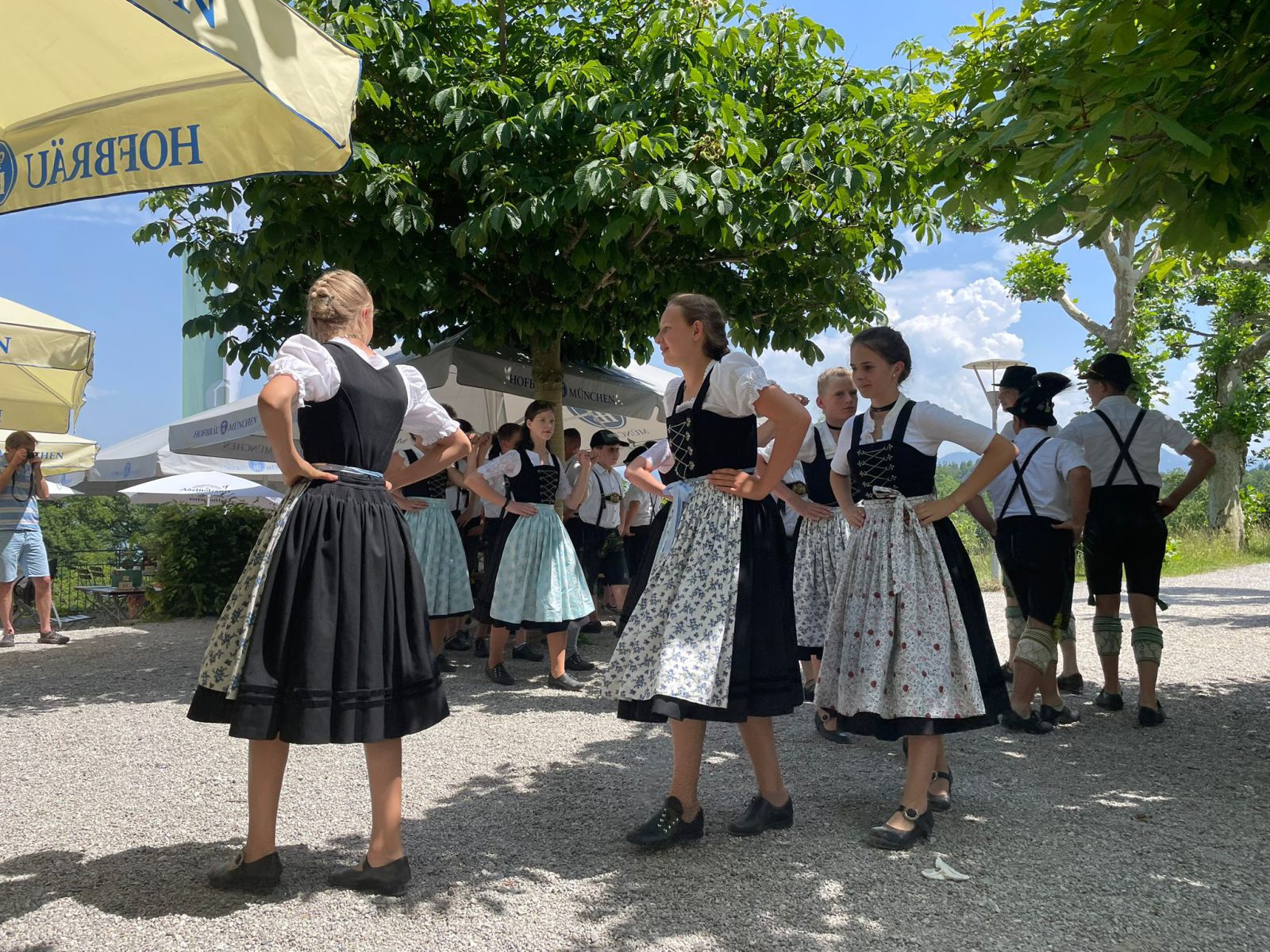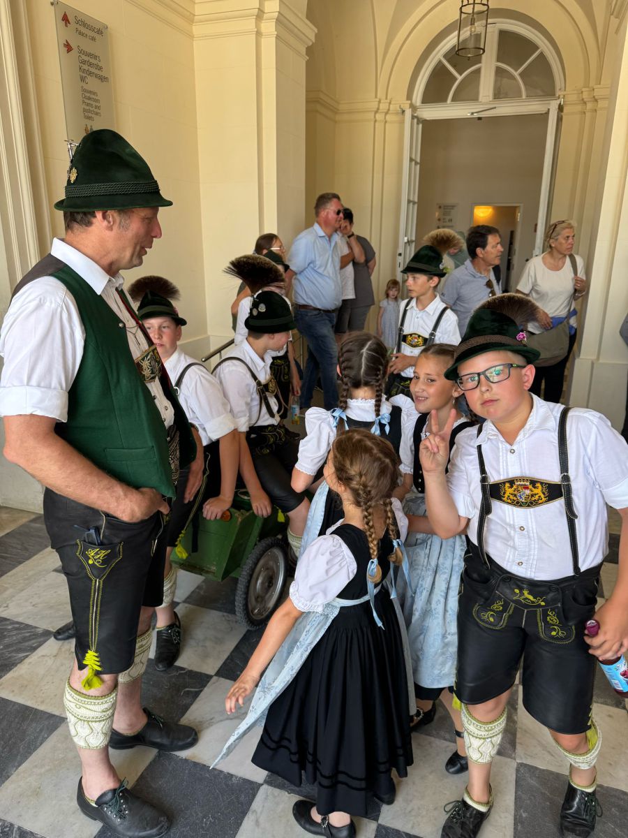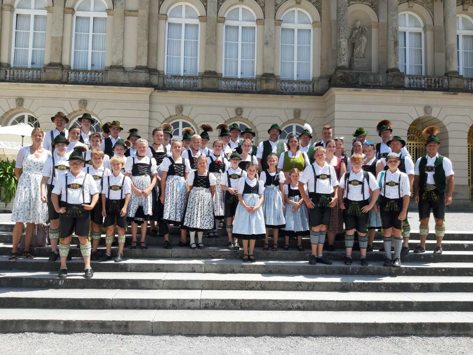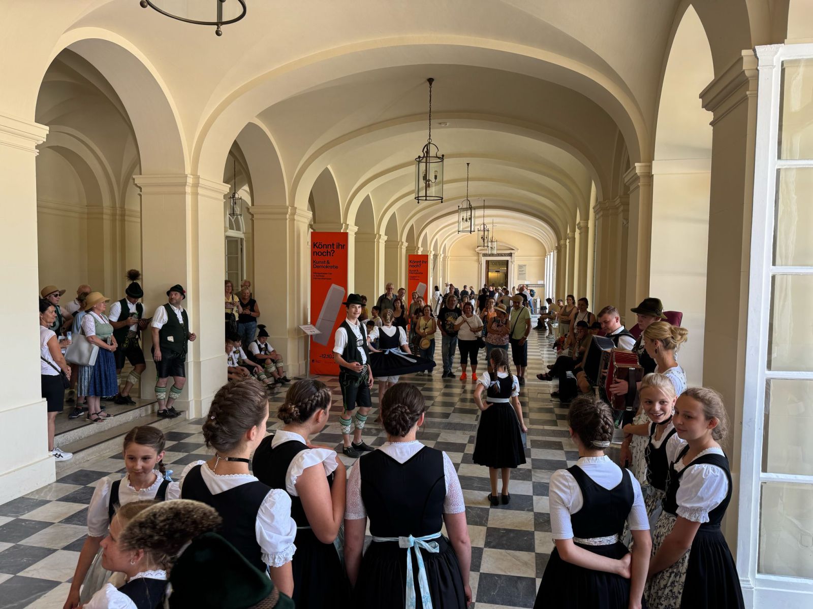 Im Schloss Herrenchiemsee angekommen, konnten es sich die jungen Trachtler nicht verkneifen, bis zur Schloss Führung vor und im Schloss mit einen stattlichen Gemeinschaftstanz und ein paar flotten Plattlern die Wartezeit zu überbrücken.