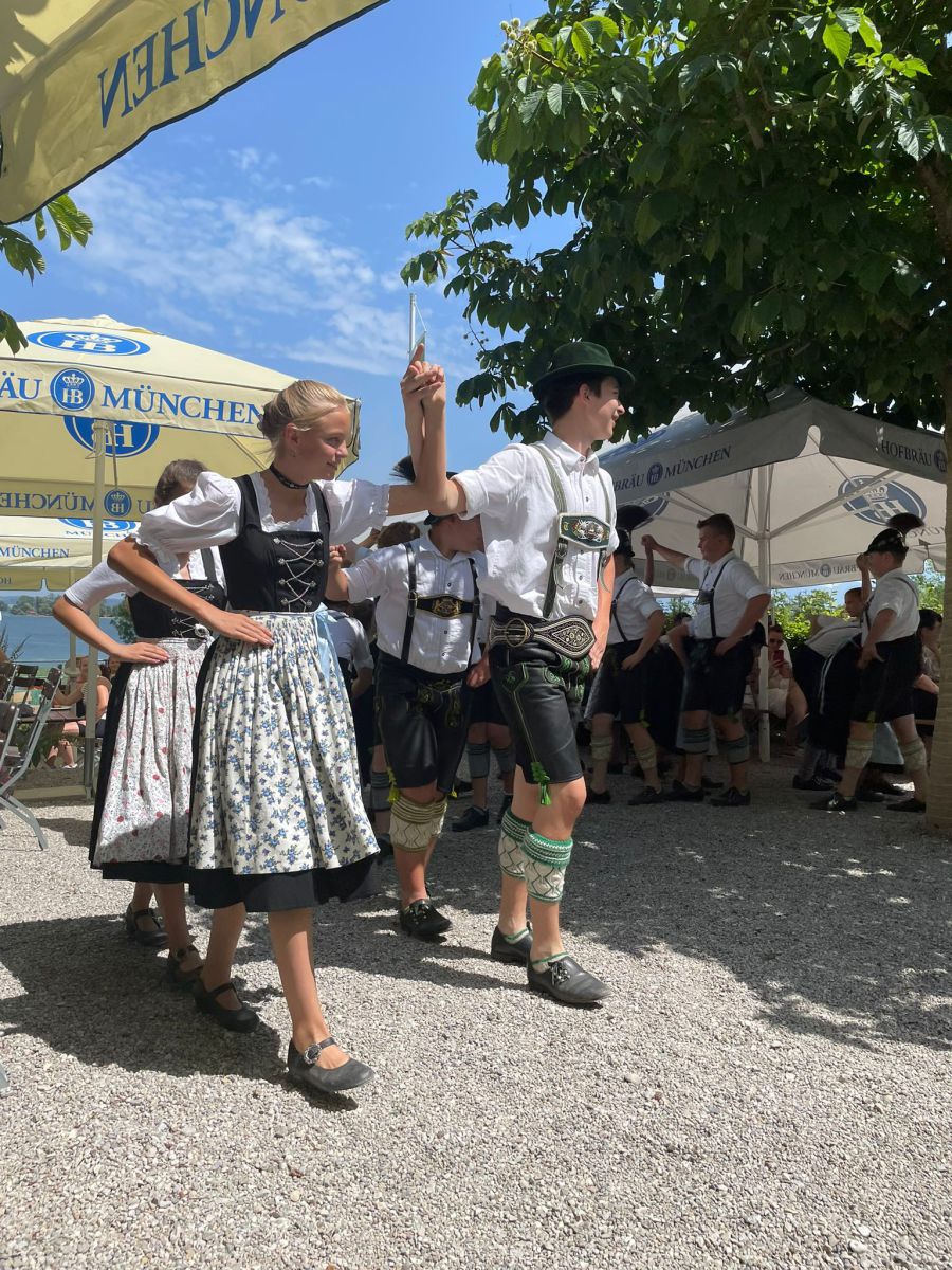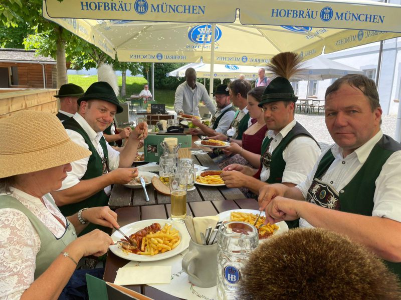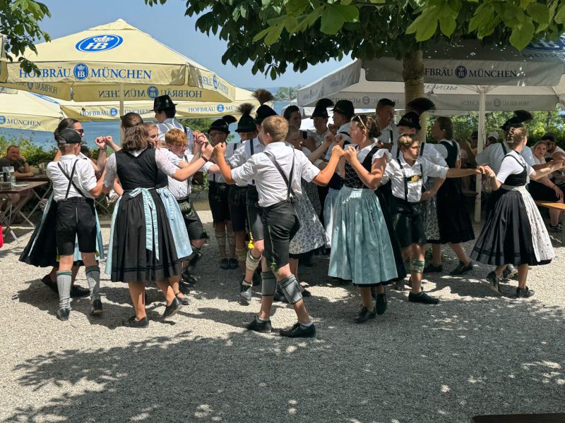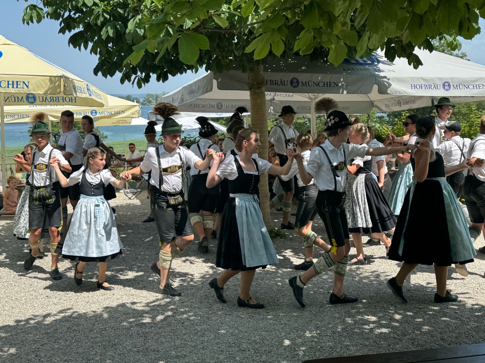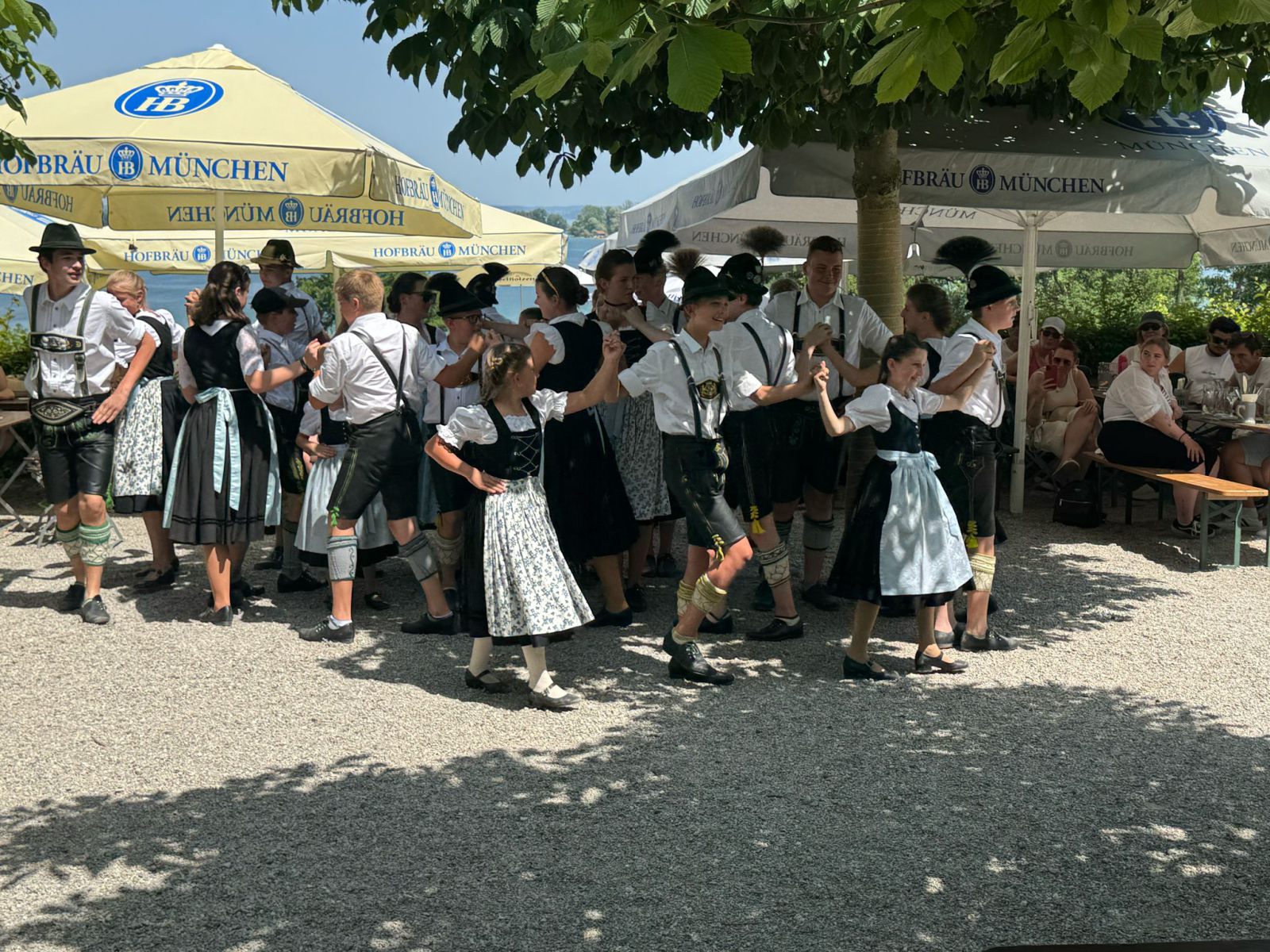 Zum Mittagessen gingen wir rüber in das alte Schloss zu Schlosswirtschaft, wo wir uns stärkten und den Ausblick über den Chiemsee genießen konnten. Zu erfahren, dass hier das Grundgesetz unserer Bundesrepublik vor 78 Jahren entstand und welche Verbindung die Geschichte dieses Schlosses über Jahrhunderte mit unserem Gasthaus Feldwies hat, beeindruckte uns sehr. Natürlich plattelten und tanzten wir auch hier noch spontan im Biergarten und bereiteten somit nicht nur uns selber, sondern auch den anderen Gästen eine Freude.