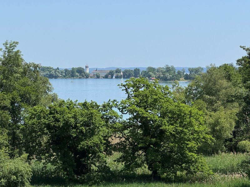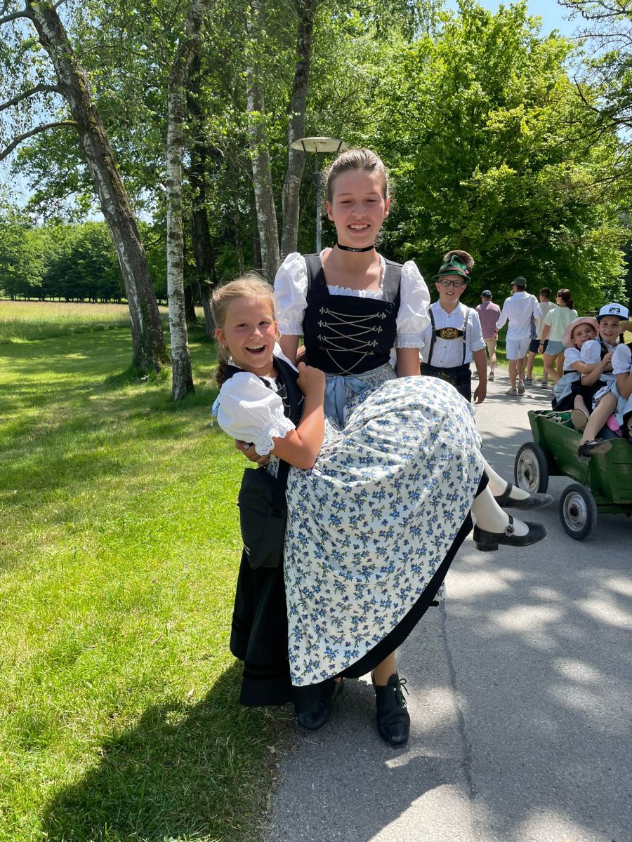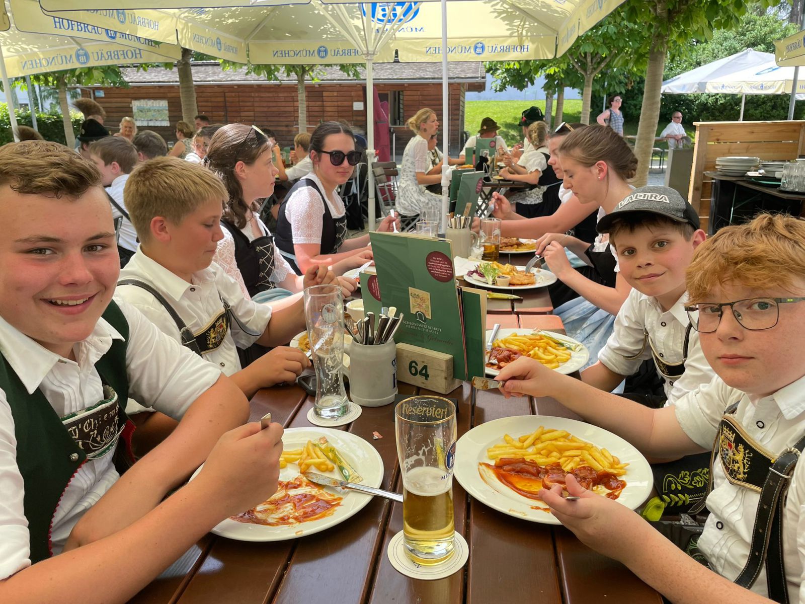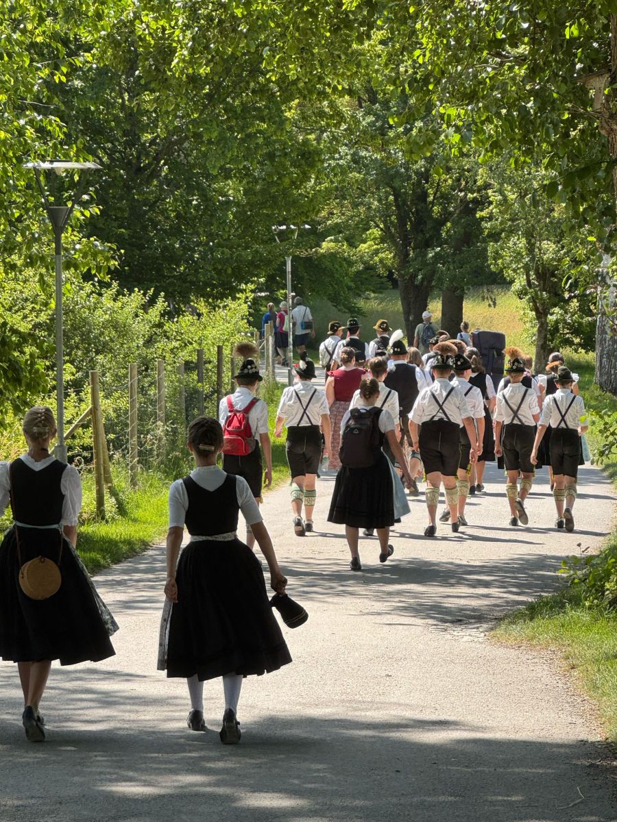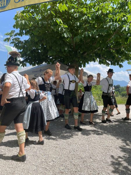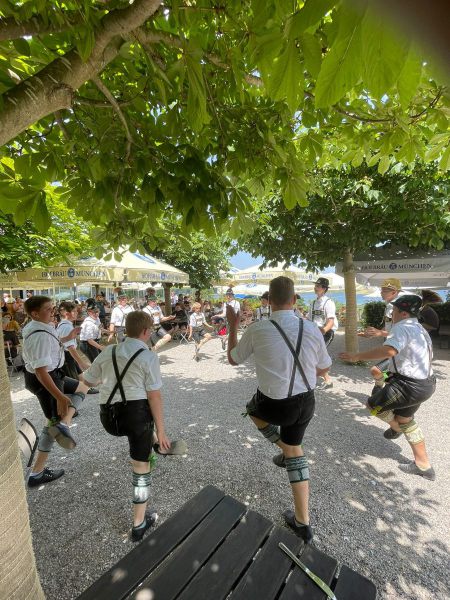 Zum Mittagessen gingen wir rüber in das alte Schloss zu Schlosswirtschaft, wo wir uns stärkten und den Ausblick über den Chiemsee genießen konnten. Zu erfahren, dass hier das Grundgesetz unserer Bundesrepublik vor 78 Jahren entstand und welche Verbindung die Geschichte dieses Schlosses über Jahrhunderte mit unserem Gasthaus Feldwies hat, beeindruckte uns sehr. Natürlich plattelten und tanzten wir auch hier noch spontan im Biergarten und bereiteten somit nicht nur uns selber, sondern auch den anderen Gästen eine Freude.